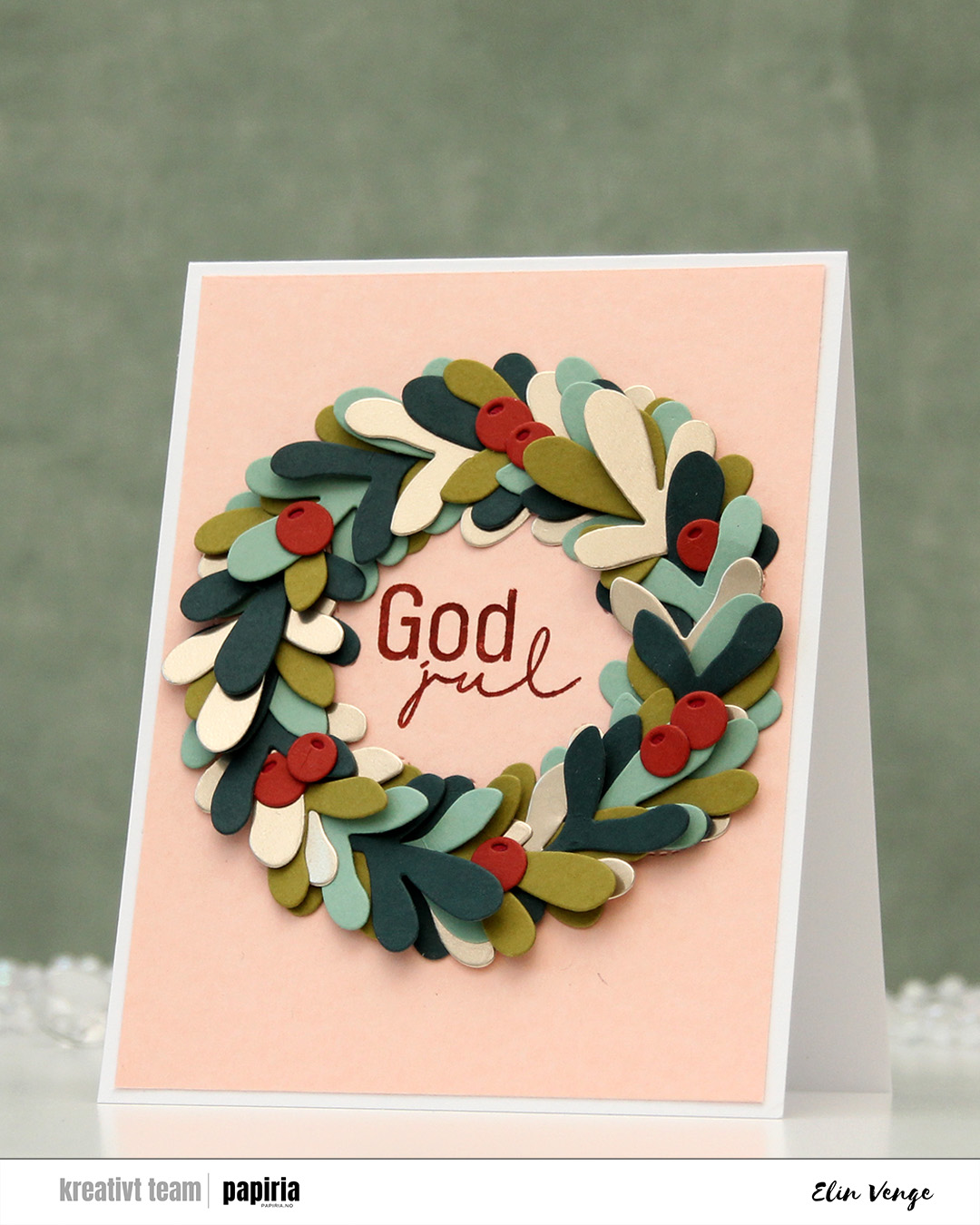 I die cut the “map” from the Joyful Wreath die set into a panel of Nectar cardstock. This die doesn’t actually cut anything, but is a great placement guide when gluing all the leaves on top. I die cut the leaves from Eucalyptus, Rainforest, Grasshopper and Champagne cardstock and put a drop of liquid glue at the base of each, which made it possible to lift the leaves off the panel for an airy feel.