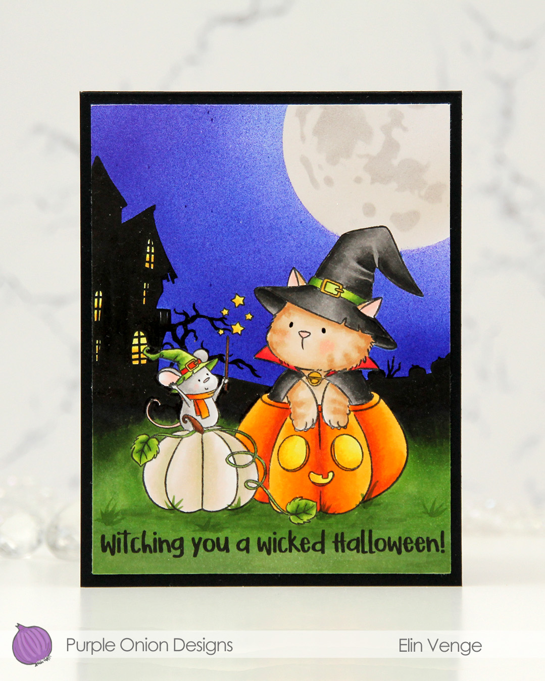 I masked off the scene and put a moon mask from an old Simon Says Stamp Stamptember collaboration with Tim Holtz into the top right corner, before I went in with Copics and an airbrush to create the sky. I used three colors of blue, trying to make it a bit lighter near the moon and darker further away. I took off the moon mask, masked the sky and airbrushed into the circle opening using E40 for a very pale moon. I then added the detail mask for the moon and airbrushed the openings with T1, which is a very light grey that I also used for the mouse. Once all the coloring was complete, I removed all the masks, added a bit of black glaze pen to their eyes and stamped a sentiment at the bottom using Obsidian ink from Altenew, before trimming the panel down a little and adhering it to a card base I created from Black cardstock from Concord & 9th to finish.