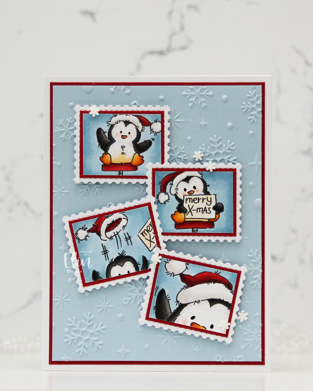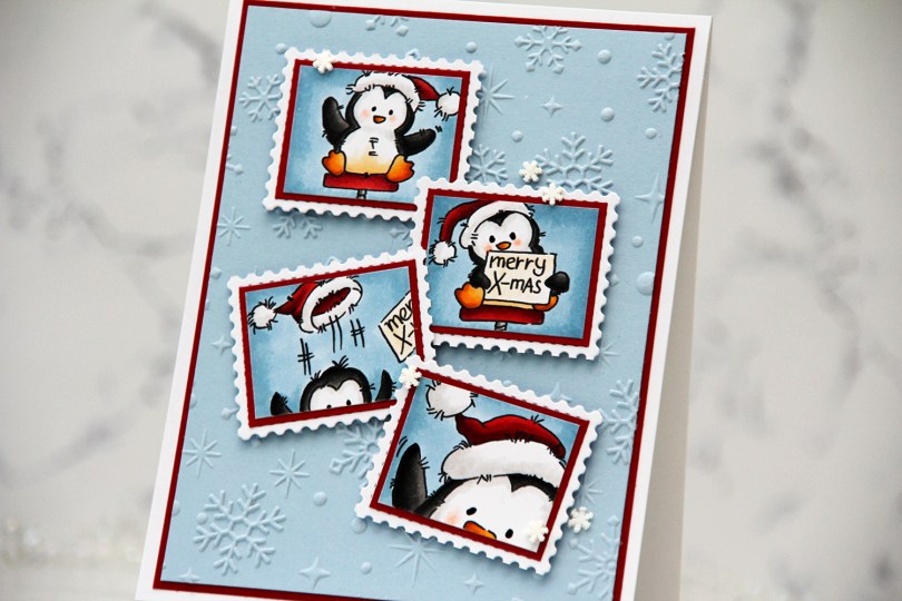 I adhered each of my colored images onto Cranberry cardstock for a nice framed look, then adhered my matted images to postage stamps I die cut with the Postage Collage die from Waffle Flower.