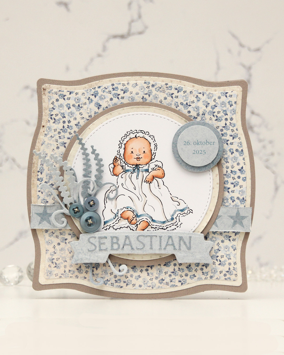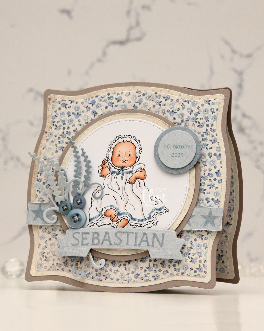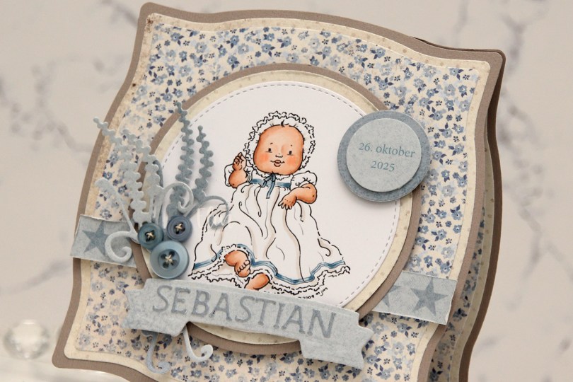 I popped some pieces up using foam tape, die cut the letters for the name using an alphabet die set from Scrapmagasinet and adhered the letters to a banner I die cut with an old die from Spellbinders. I used an old die from Marianne Design for the spriggy things on the left, and used some old Blueberry Sky buttons from Papertrey Ink to embellish.