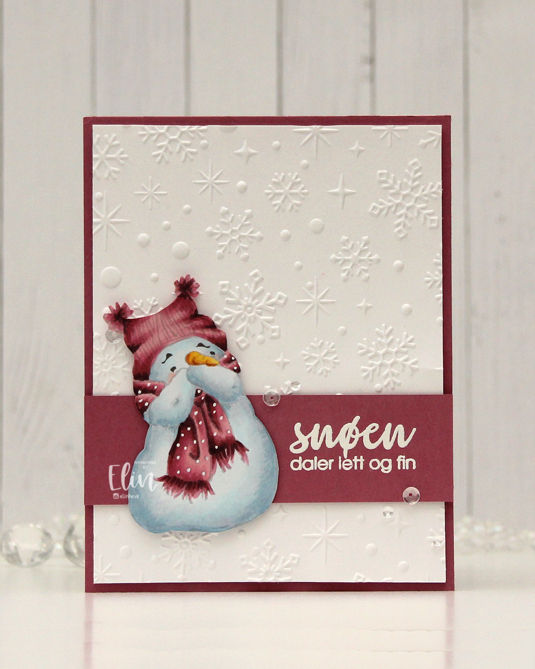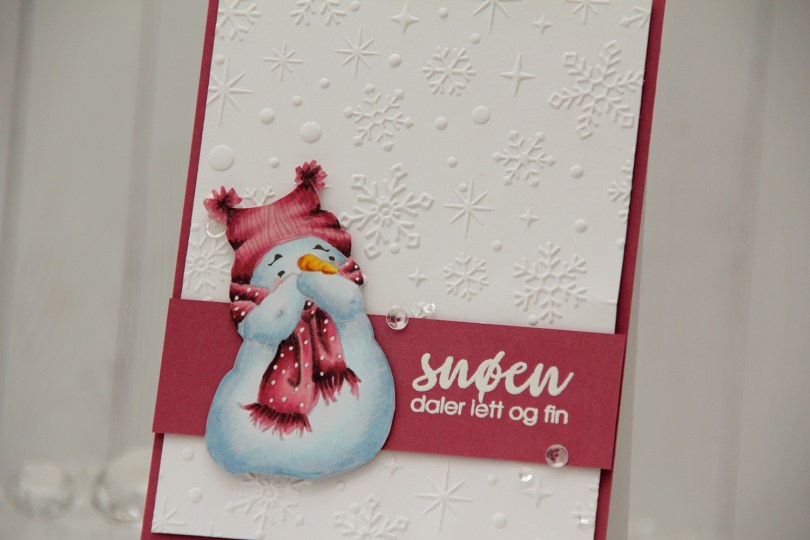 I trimmed my embossed panel slightly, added a couple of layers behind it and adhered it to a card base covered with a panel of Autumn Rose cardstock from Papertrey Ink. On a separate piece of Autumn Rose cardstock, I stamped a sentiment from the Snøstorm stamp set from byCino using VersaMark ink, before sprinkling on super fine detail embossing powder from Ranger and melting it until it was smooth. I cut my sentiment down to a wide strip, added a layer to the back of it for a little bit of dimension, then put a couple of additional layers behind the snowman before gluing him down and finishing the card with a few sequins from the Assorted Moonshine mix from Simon Says Stamp.