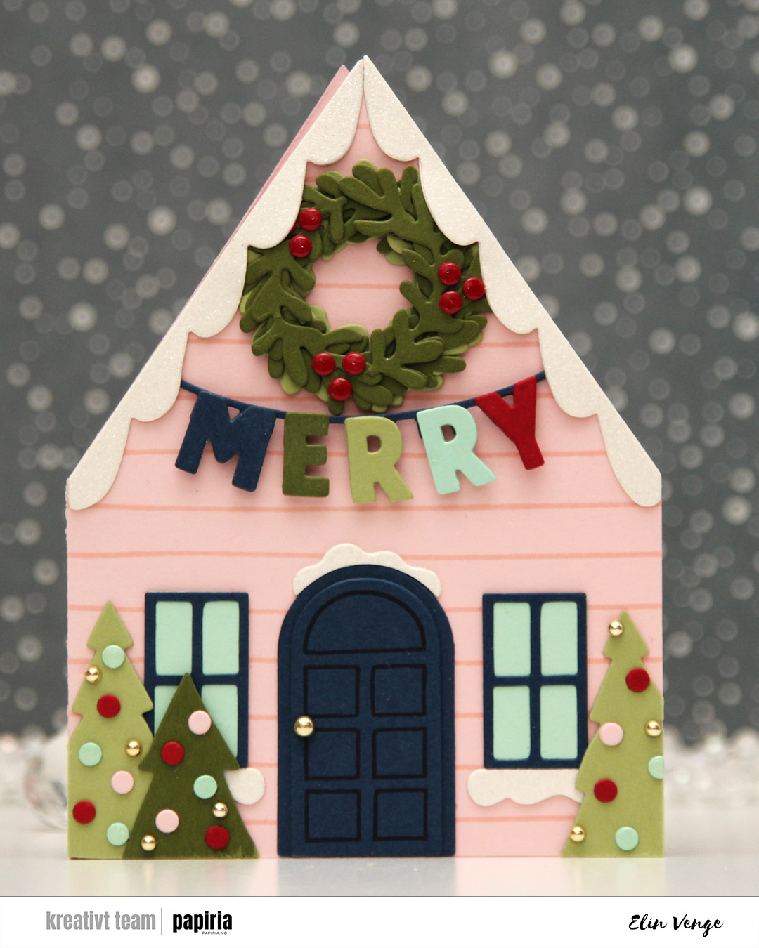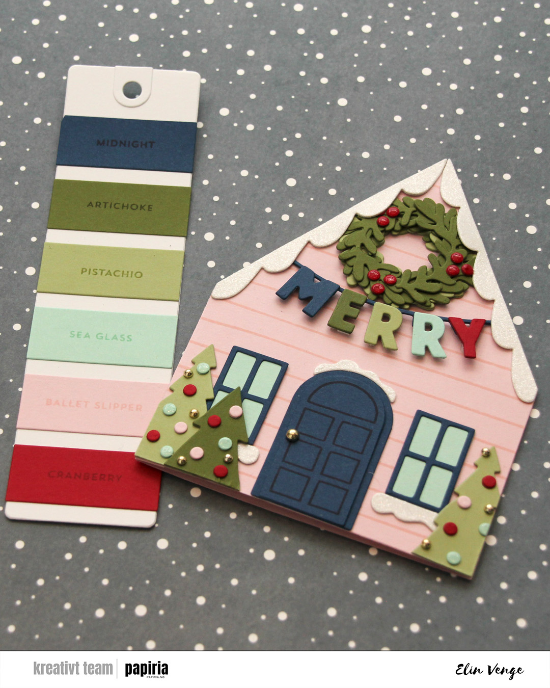 Time for the bells and whistles. This die set is packed full of so much stuff you can add, there’s really no limit to what you can do. I chose a fun color combo of Cranberry, Midnight, Artichoke, Pistachio and Sea Glass to match the Ballet Slipper nicely. I doubled up the die cuts on nearly everything, even adding white glitter cardstock from Kort & Godt for the snow. On the door, I stamped the coordinating door stamp in Midnight ink, I popped up the letters, added a thick layer of Glossy Accents to the berries on the wreath, a somewhat thinner layer on the Sea Glass ornaments and some gold enamel dots to finish. I even used a gold enamel dot for the doorknob.