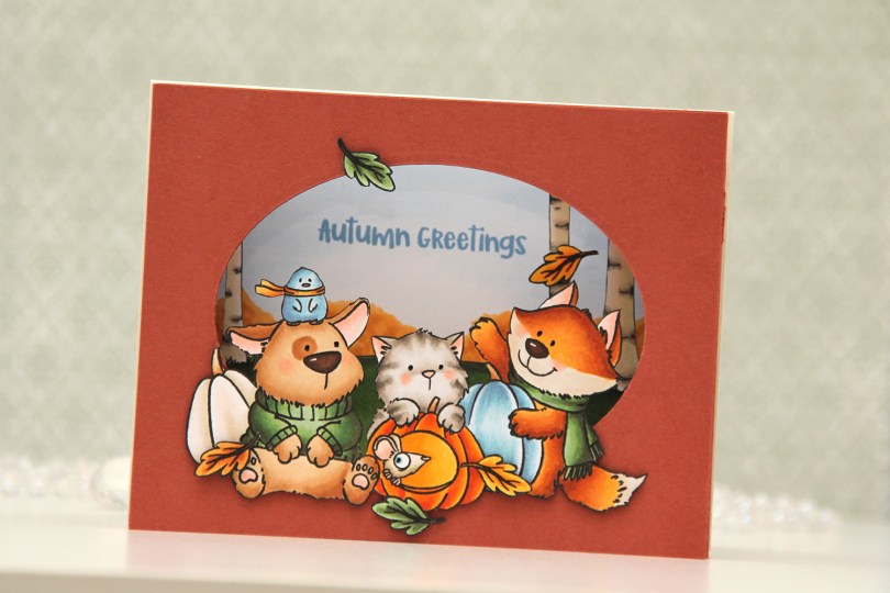 I stamped my images (both the critters and birch tree background) on separate panels of X-Press It blending card with Copic friendly ink, colored them in and fussy cut them. Before fussy cutting the critters, I actually stamped over my initial stamping with Obsidian ink from Altenew, which gives super black lines that are extra crisp. It’s a pigment ink, though, so it needs to be stamped after the coloring. I also colored a sky and some bushes on a separate panel, where I stamped my sentiment in Blueberry Sky ink from Papertrey Ink. I cut an oval into a panel of Americana cardstock from Papertrey Ink using an old oval die from Spellbinders (Petite Ovals Large) and then created two pieces of accordion folds in the same color cardstock. I glued my background with bushes and sky to the back of the accordion pieces, the birch trees in the center, and the panel with the oval window in front. I mounted my critters using foam tape and used black glaze pen for the eyes. I then adhered my accordion to a top fold card base I created from Rustic Cream cardstock from Papertrey Ink.