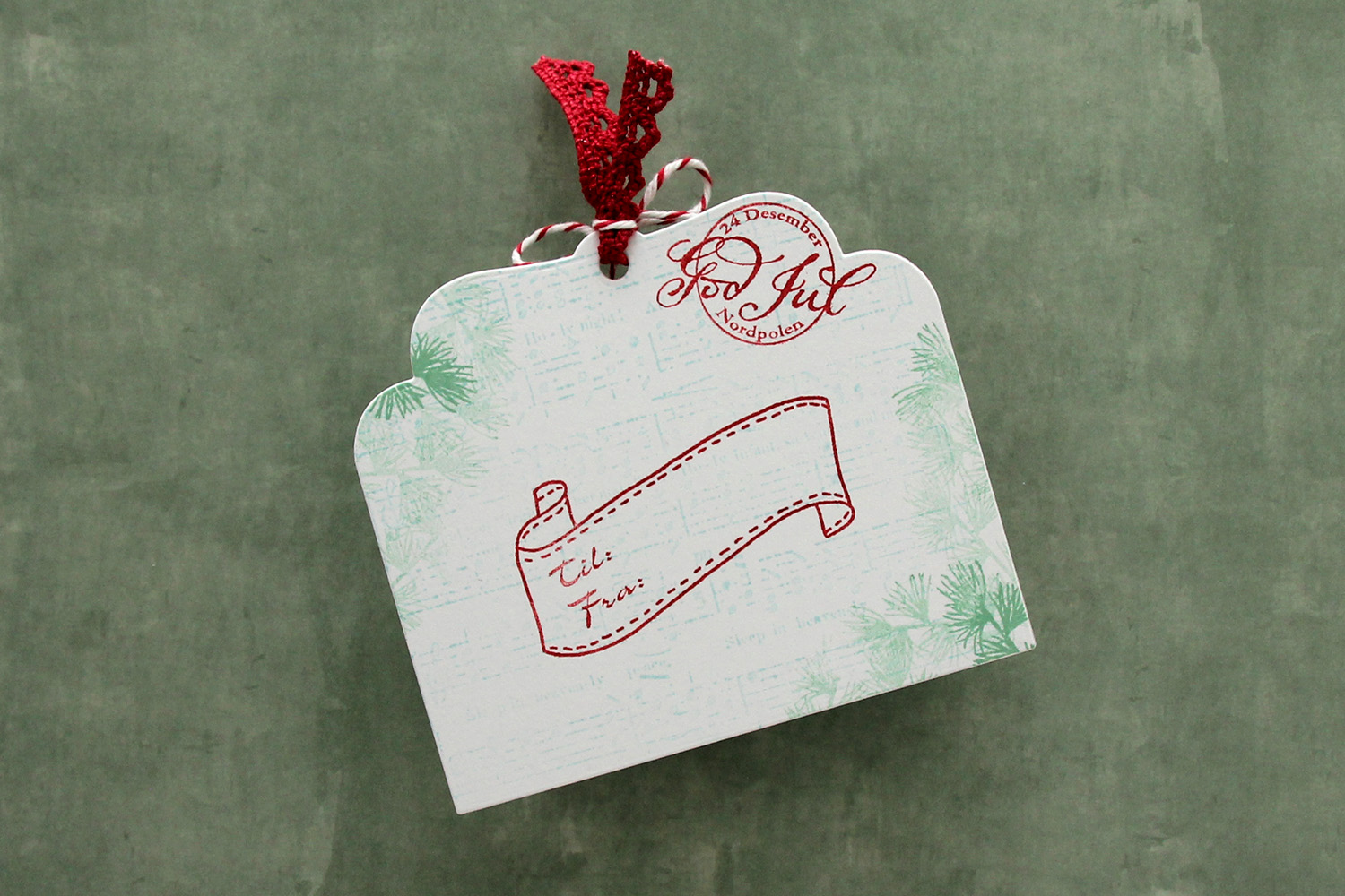 I die cut the tag a second time from white cardstock and did quite a bit of stamping on it. I used second generation stamping of an old sheet music stamp from Magnolia using Powder ink from Concord & 9th – I wanted it to be very soft. The sheet music is actually for Silent Night, making it extra Christmas-y – not that you can really tell. I used first and second generation stamping of a branch from a Mathia Design stamp set using Eucalyptus ink from Concord & 9th to add a little something to the corners. I stamped a postmark stamp from Ladybug & Friends, as well as a to/from stamp from Norsk Stempelblad AS using Amarena Cherry ink from My Favorite Things. I don’t think Ladybug & Friends is in business anymore. Neither is Norsk Stempelblad, but I love their stamps and can’t bring myself to stop using them.