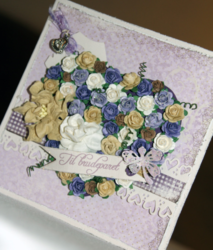 I’ve made a wedding card on order. I must admit I’ve never really been a fan of purple, but I fell in love with the gorgeous design papers from Maja Design. I entered my card in Kort-O-Mania at scrapping.no, this week’s challenge was punches and dies. I’ve used dies from Magnolia and heaps of flowers, mainly from Papirloftet and Papirdesign.
