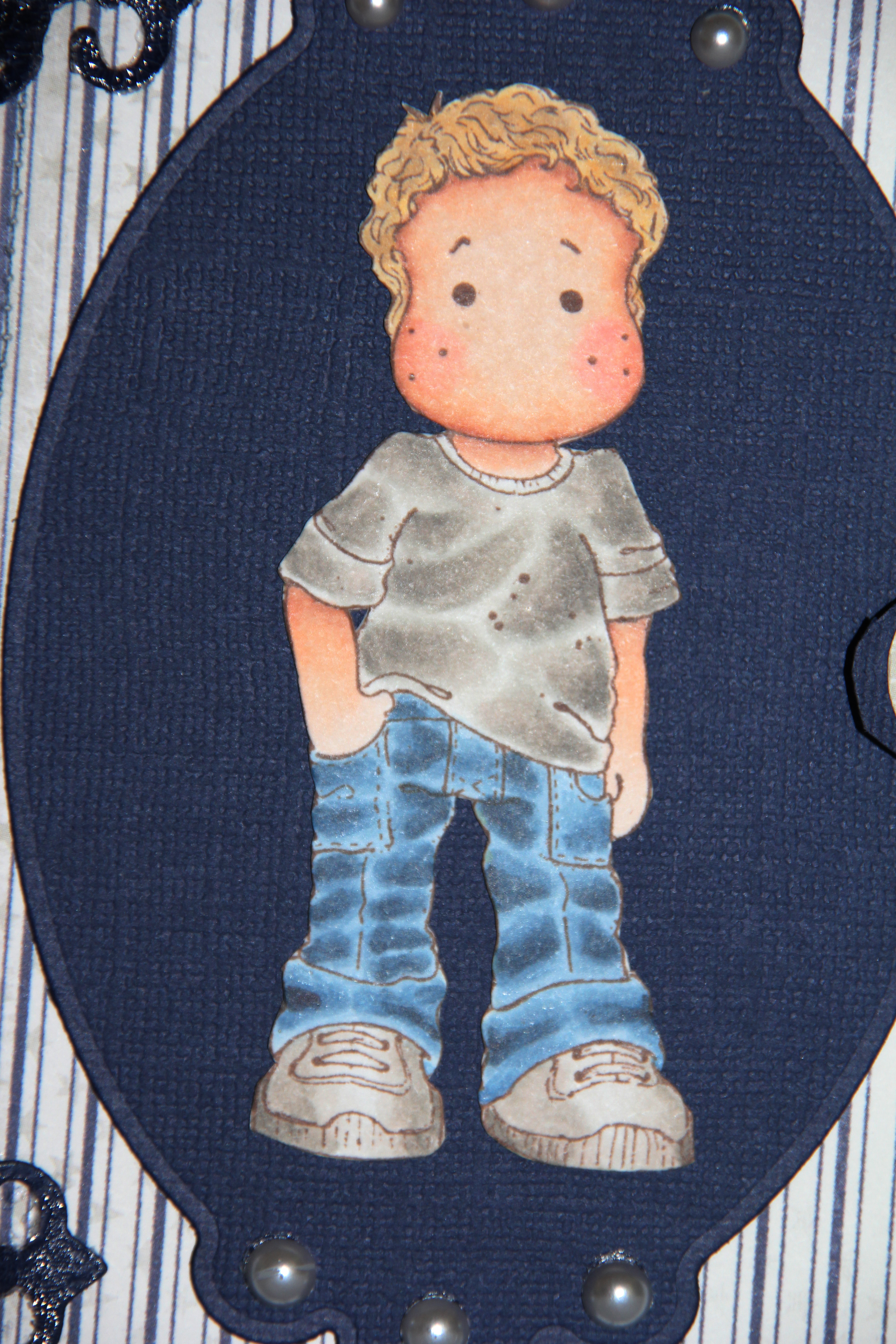 Nok en gang ble jeg ikke fornøyd, men her er da bokeskekortet mitt. Edwin er farget med Copics (B99, 97, 95, 93, 91, E13, 11, 00, 000, 0000, R20, W5, 3, 1, har glemt hva jeg brukte til håret) og papirer er fra Maja Design.