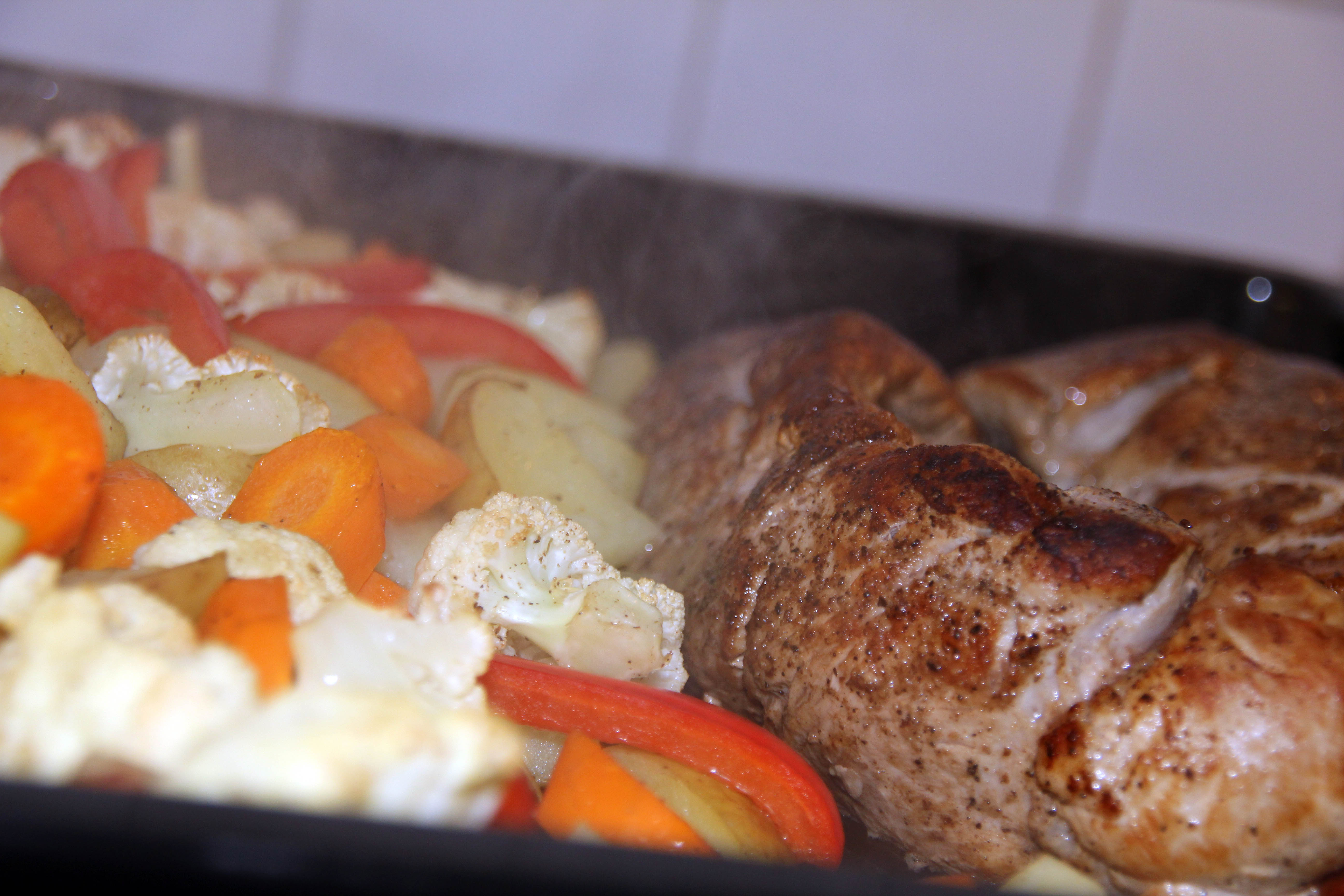Masse gode grønnsaker stekt i ovnene med rapsolje og indrefilet. Bearnaisesaus og noe godt i glasset ved siden av.