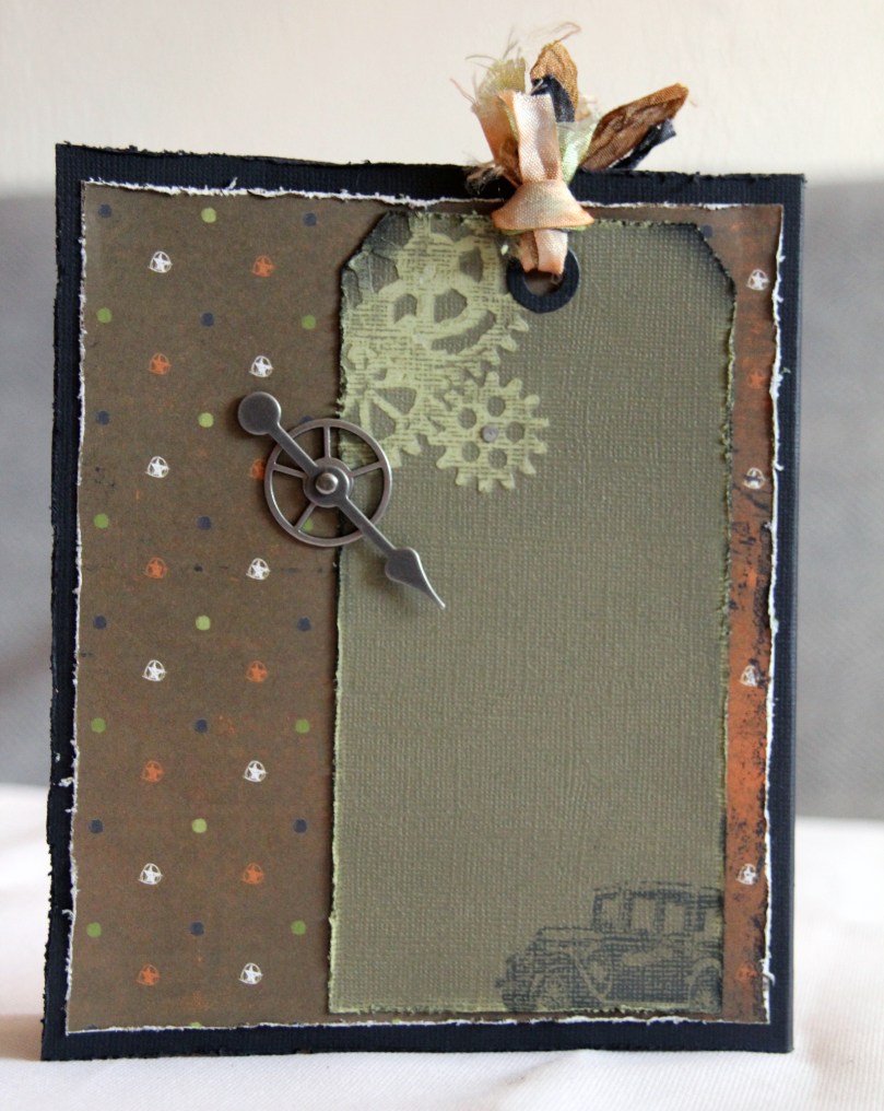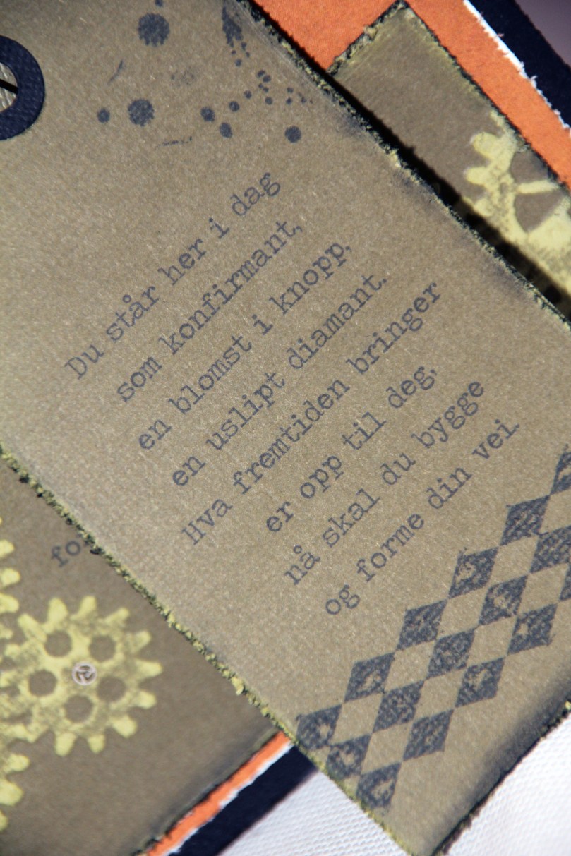 Over til dagens kreasjon. Etter besøket i godtebutikken i går fikk jeg besøk av søs som bestilte et konfirmasjonskort til en gutt. Det skulle være røft, ellers fikk jeg frie tøyler. Jeg øynet muligheten til å få brukt noe av alt stæsjet jeg hadde kjøpt, og gledet meg til å lage noe som ikke inneholdt en eller annen søt Magnolia-figur. Nok en ting jeg virkelig ikke hadde trodd. Jeg koste meg med distress-inks, dabbere, dies og griset noe voldsomt, jeg syns til og med det var gøy. Nesten utrolig for en som i utgangspunktet hater å få søl av noe som helst slag på fingrene. Og kort ble det, fint kan det vel ikke kalles, men syns det ble røft og tøft, som var oppdragsteksten jeg fikk fra søs.