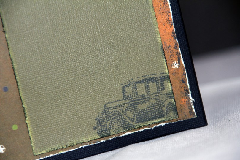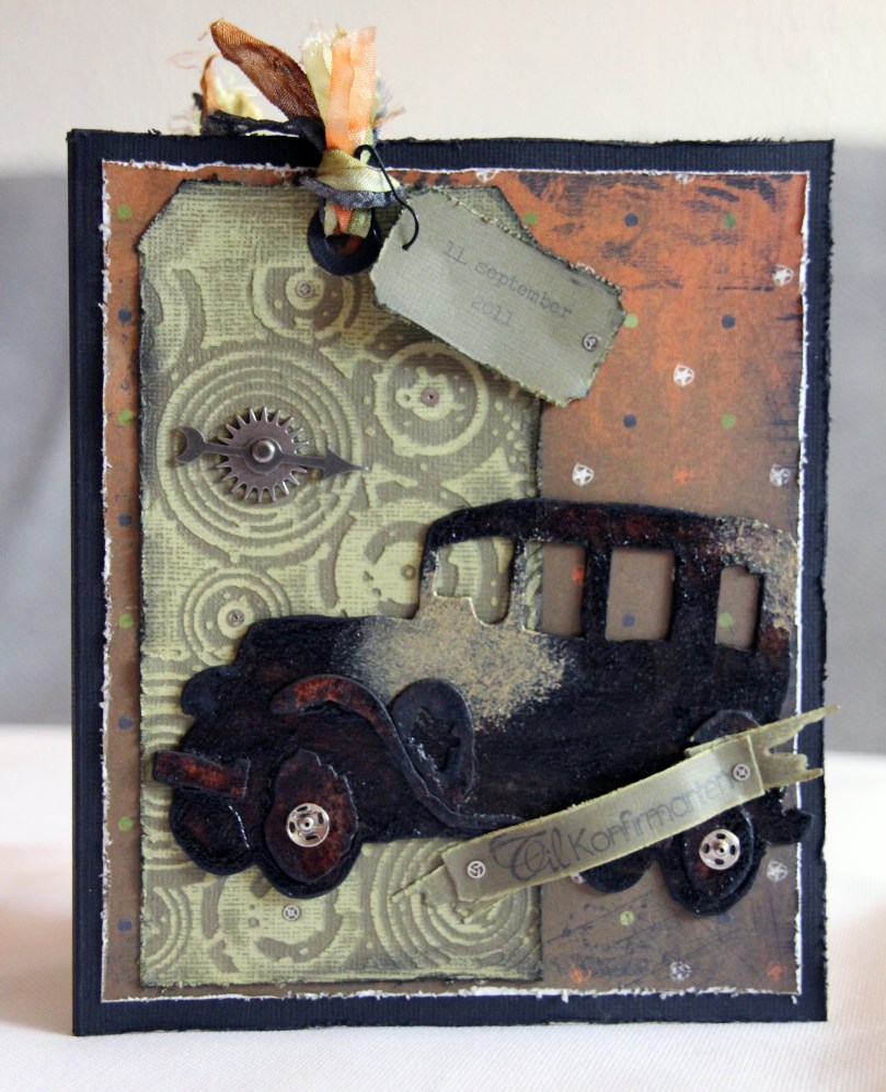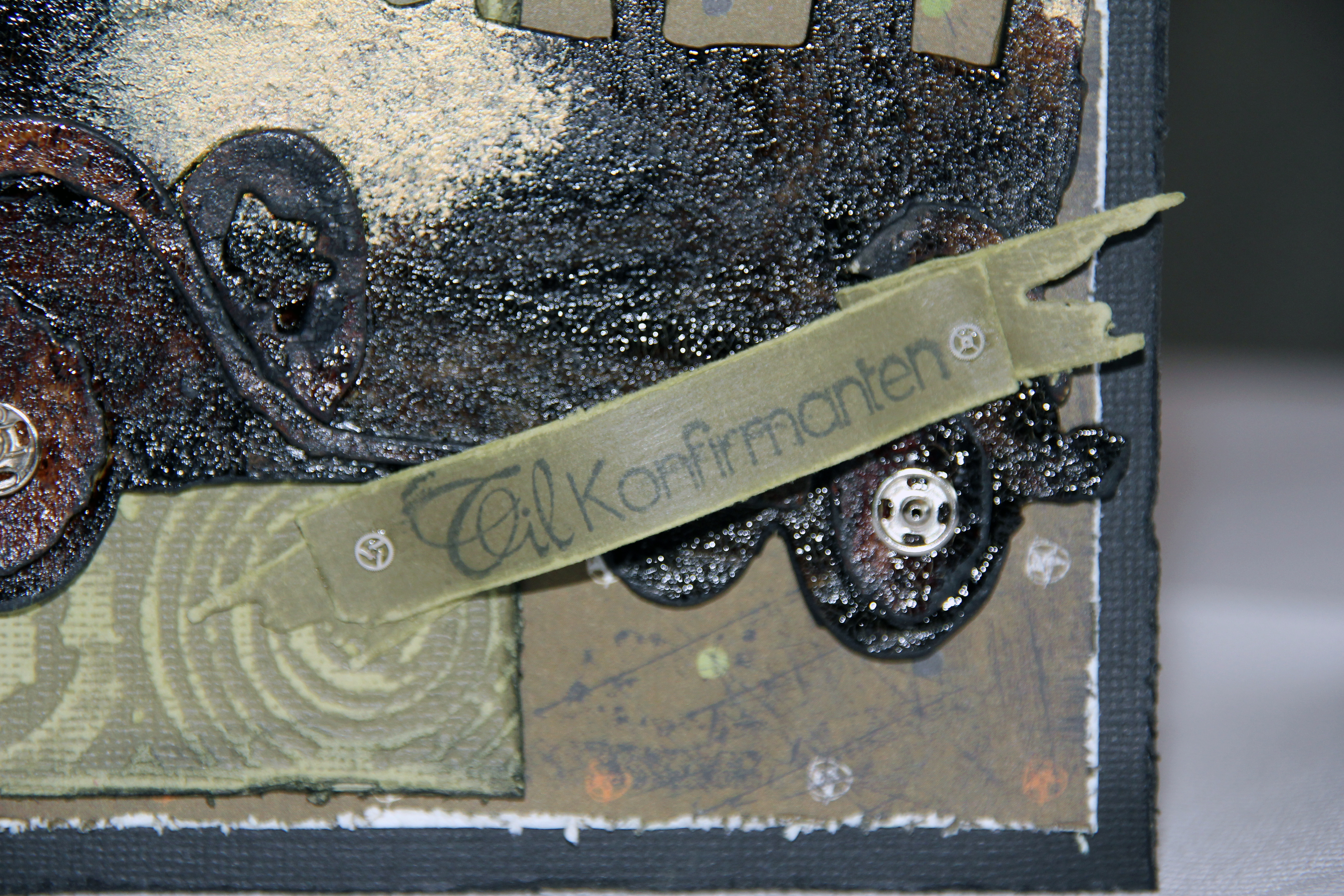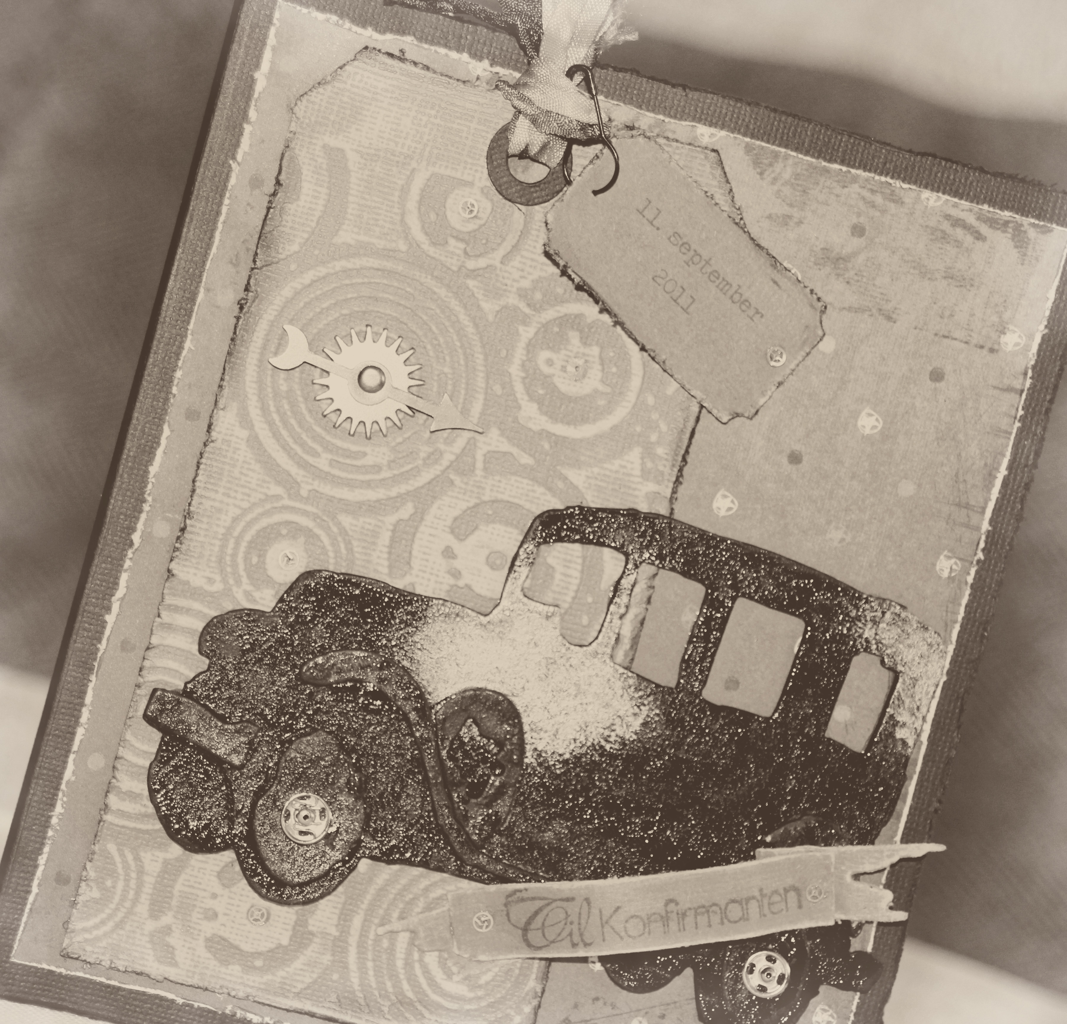Har stanset ut TH Old Jalopy (kjøpt i går) i grungeboard (kjøpt i går), malt den med vintage photo (kjøpt i går), walnut stain og black soot (kjøpt i går), gått over etterpå med distress crackle paint rock candy over hele bilen. På kantene av bilen har jeg brukt svart dabber (kjøpt i går) for at kantene ikke skal være grungeboard-grå. På bilen har jeg brukt litt gull-dabber (også kjøpt i går, nevnte jeg at pengene flyr ut av kontoen?) Billetten med konfirmasjonsdatoen er stanset ut med TH ticket strip (kjøpt i går) før jeg har brukt sandpapir på kantene for å få frem den lyse fargen i kartongen, brukt edge distresser for å få rufsete kanter og så svertet kantene med black soot.