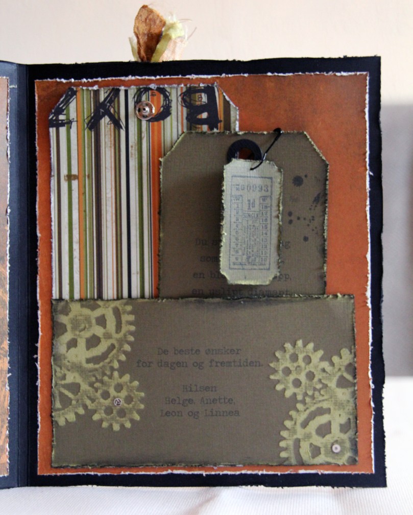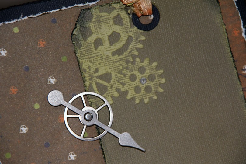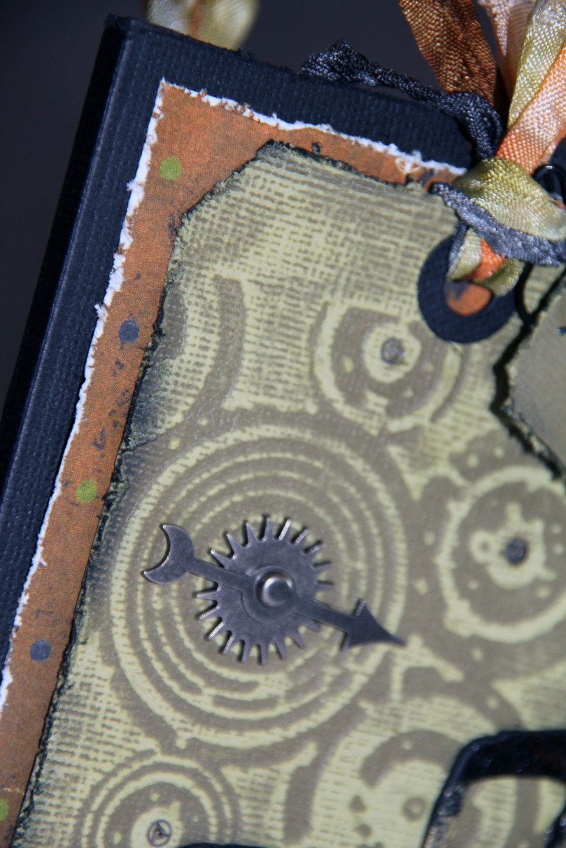 Jeg har satt på sprocket gears (kjøpt i går) og game spinners (kjøpt i går) på den store tagen på forsiden. Fant ut at den passet fint midt i en retrosirkel. Jeg har stanset ut reinforcers med tiny tabs and tags fra TH (kjøpt i går) i svart bazzill og satt på noen knøttsmå tannhjul (kjøpt i går) rundt omkring på retrosirklene. I tagen har jeg festet seam binding som jeg har fargelagt (en med black soot, en med vintage photo, en med Copics YG93, 97 og 99, og den siste med Copics YR12 og 18). Det er ingen tvil om at jeg foretrekker Copicsene til å fargelegge bånd med. Copicsene gir mye mer fargespill i båndet, er ikkenoe søl i motsetning til distress (jeg hater jo i utgangspunktet gris og søl), og i tillegg er det tørt med en gang. Jeg er utålmodig når jeg holder på med dette og det er tungvint å ta frem varmepistolen for å tørke bånd (jada, bare kall meg lat).