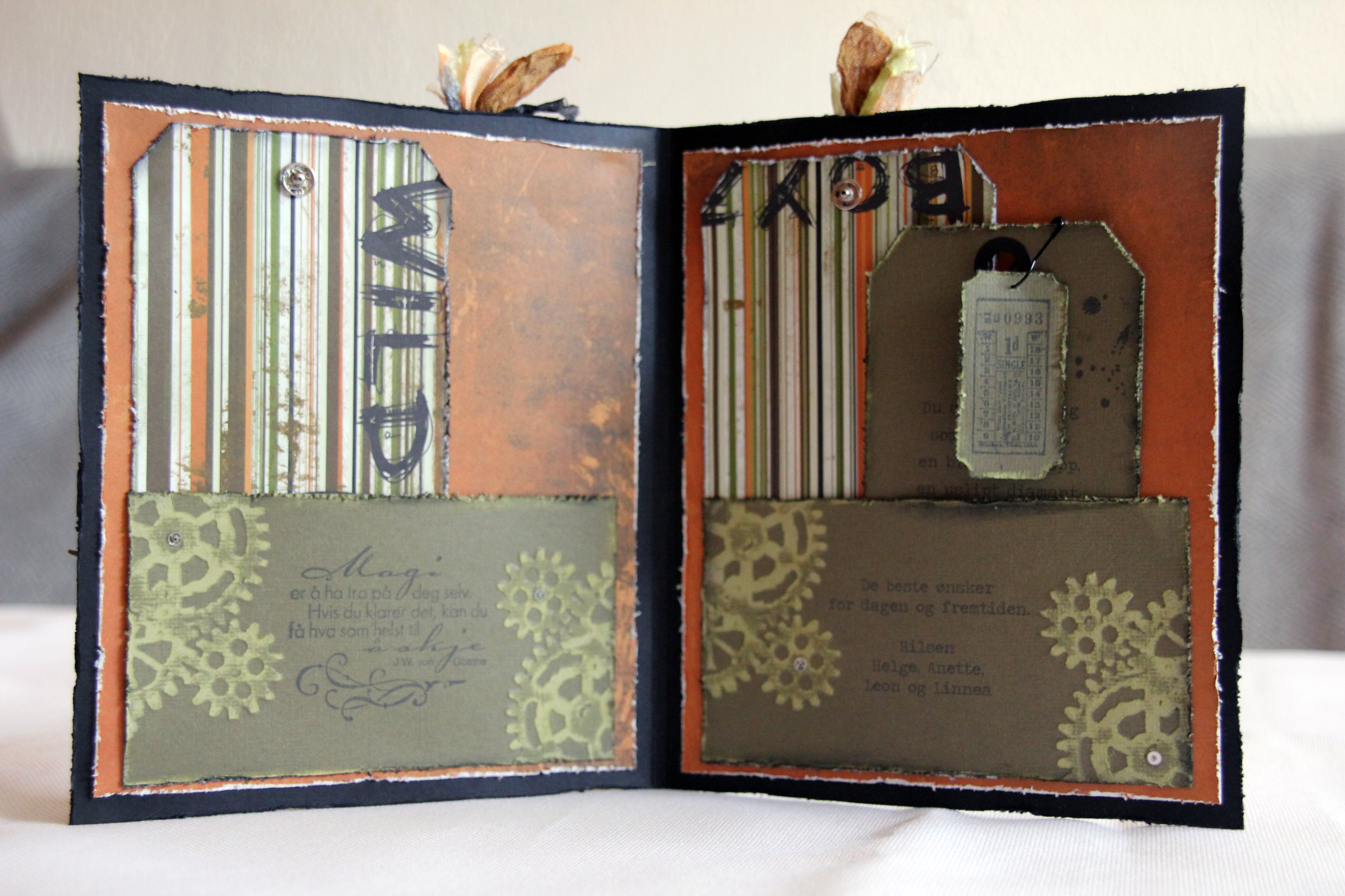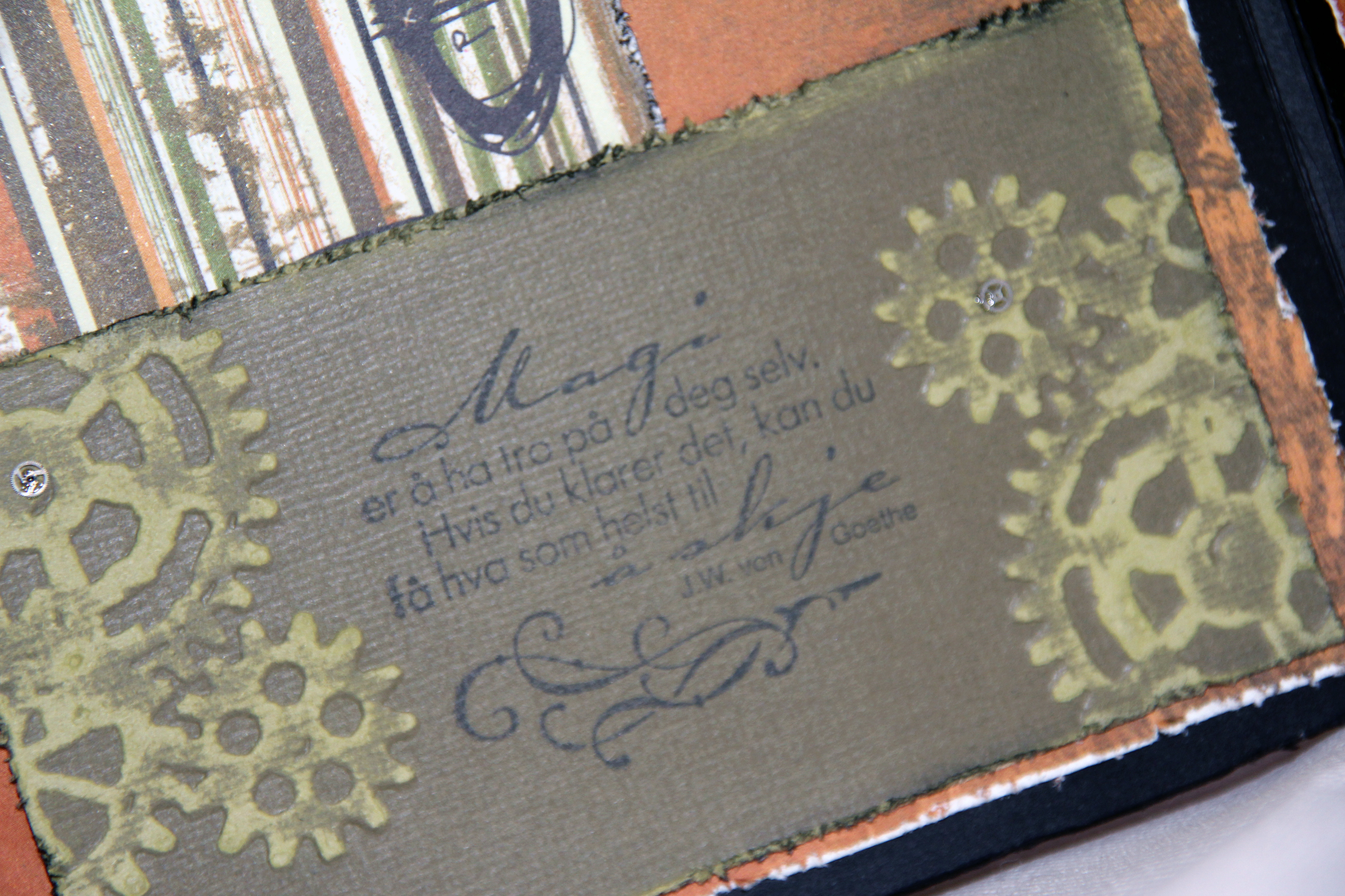Har laget en lomme med plass til penger. “Magi”-stempelet er fra Stempelglede. Har embosset lommen med tannhjul-embossingfolder fra TH (kjøpt i går). Her syns også de bittesmå tannhjulene litt bedre i midten av et par av tannhjulene.