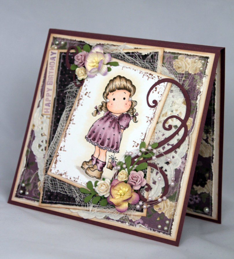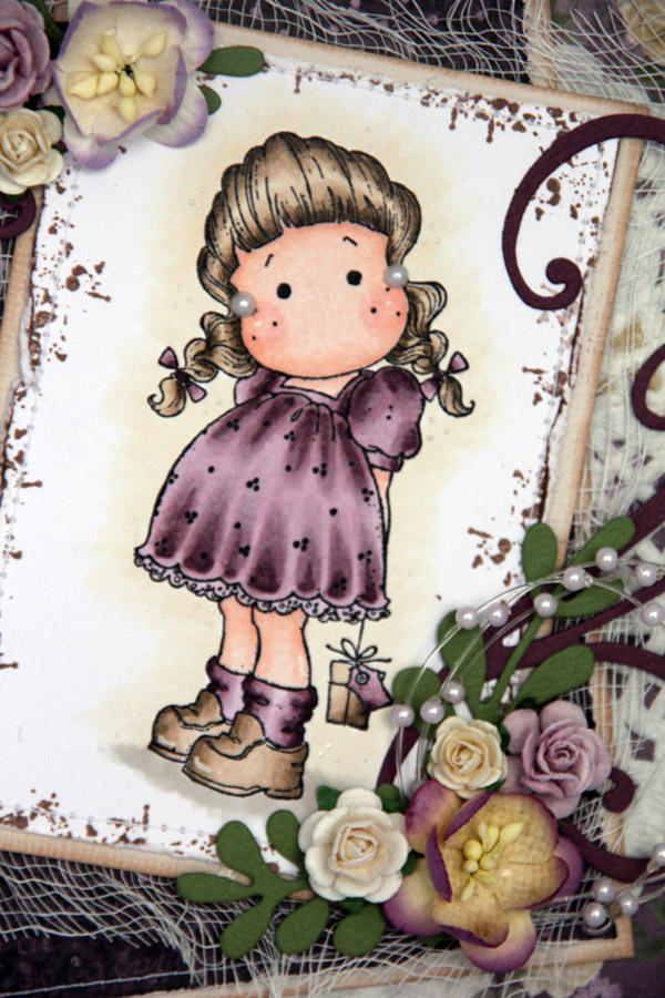 Som vanlig har jeg zoomet inn på motivet, og som vanlig er Tilda fargelagt med Copics. Hun har fått perleøredobber fra Kaisercraft. Jeg har stemplet et bittelite stempel fra Stempelglede rundt hele kanten, og sydd paneler (også som vanlig). Har funnet frem ostekluten min også til dette kortet, den blir brukt altfor sjelden merker jeg. Blomstene er en god blanding fra WOC og Papirdesign, grenene er laget med dies fra Magnolia, det samme gjelder swirlen jeg har stanset ut.