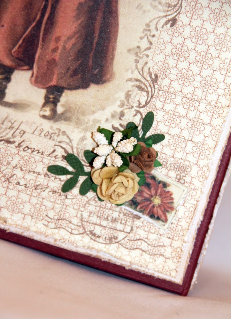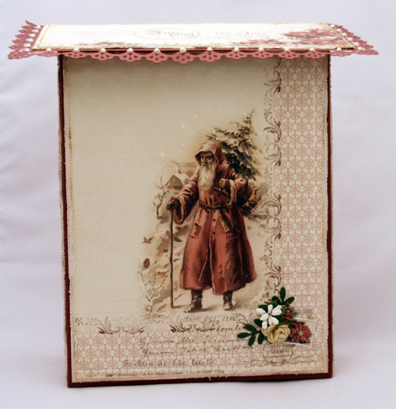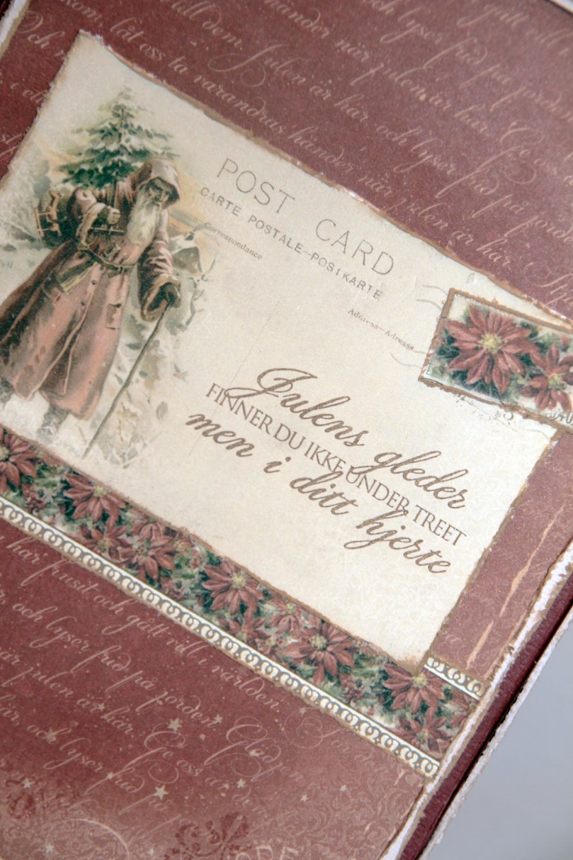 Jeg syns Pion-arkene er så fine at jeg har tillatt meg å bruke minimalt med pynt. På lokket har jeg stemplet et julepoststempel fra North Star Stamps og satt på halvperler fra Kaisercraft. Rufset alle paneler før de har fått en omgang med Cat’s Eye creamy brown.