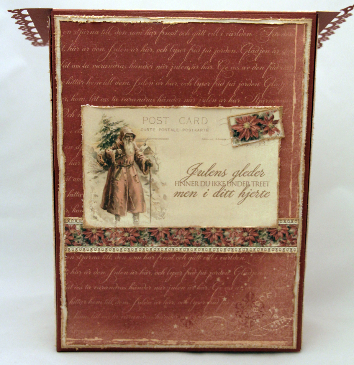Zoomet inn på baksiden igjen. Kartongen jeg har brukt på denne postkassen er Vanilla og Gypsy Rose, som er en akkurat passe møkkete rødfarge til at den passer til mønsterarkene, Bazzill har egentlig veldig få rødfarger på kartong som egner seg til noe annet enn veldig amerikansk jul, men denne ble jeg fornøyd med. Jeg er i det hele tatt veldig kresen på farger som liksom skal være julerød, det er en grunn til at jeg bare mangler 3 Copics i hele R-serien (les mer om dette i det andre postkasseinnlegget mitt), men takket være snille Marianne har jeg nå funnet en kombinasjon som fungerer.