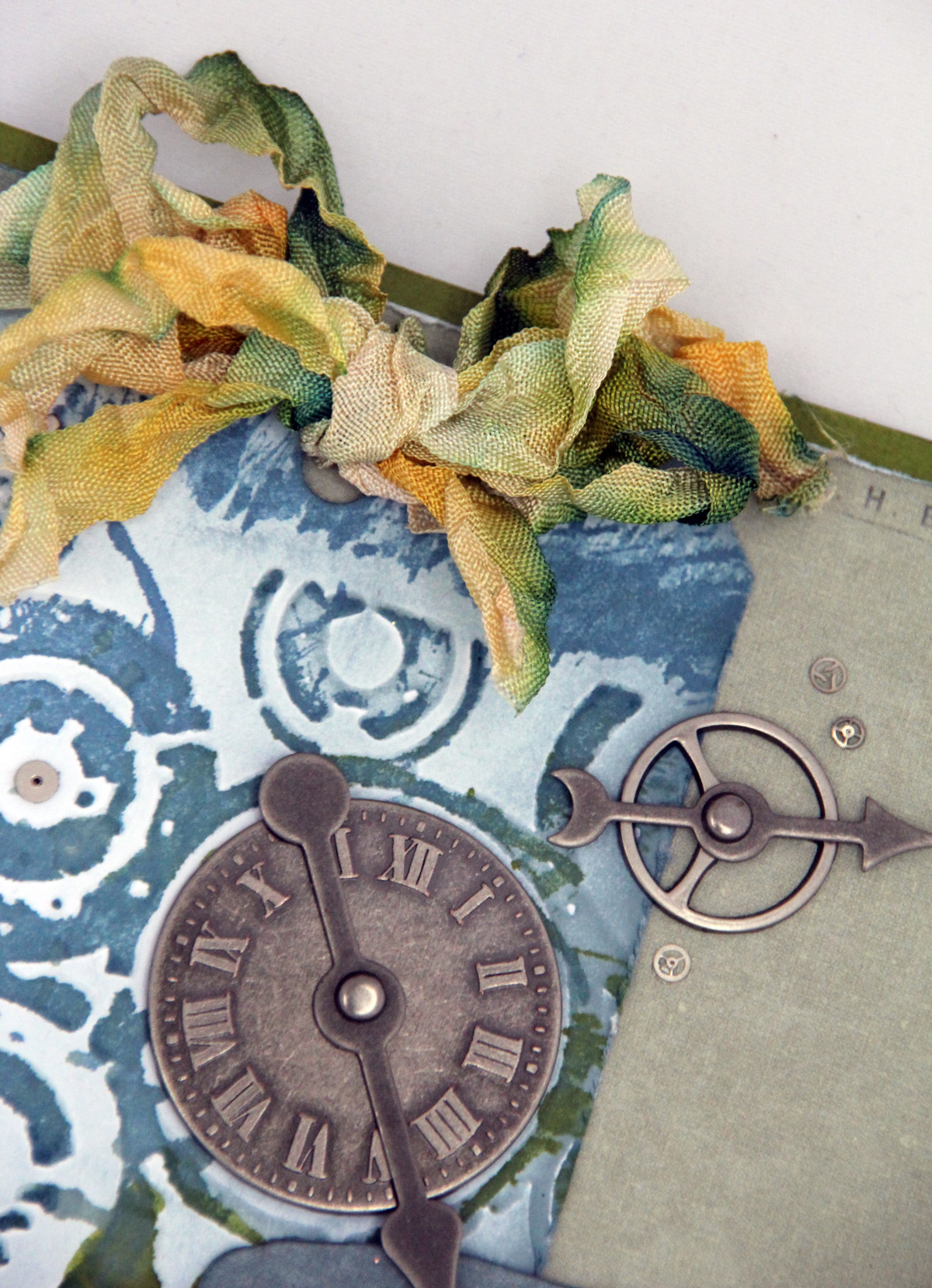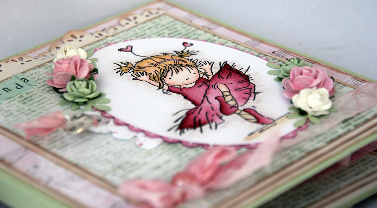 Baksiden har jeg laget veeeldig enkel. Mer av den samme blonden som er brukt på forsiden. Den er i utgangspunktet hvit, men jeg har duppet den nedi distresspute vintage photo før jeg har krøllet den sammen i hendene mine og sprayet vann på så sverten fikk spre seg litt. Av en eller annen grunn blir jo aldri mine fargingsforsøk slik jeg forventer, så denne blonden har stedvis blitt helt gul. Resten av Rosa-Marina 7-arket har blitt brukt her, og resten av blingswirlen fra Prima. Et lite stempel fra North Star Stamps stemplet på en tag jeg har stanset ut med en TH-die, før jeg har limt på en fragment-charm oppå, også den av TH, festet i blonden med jump rings fra TH.