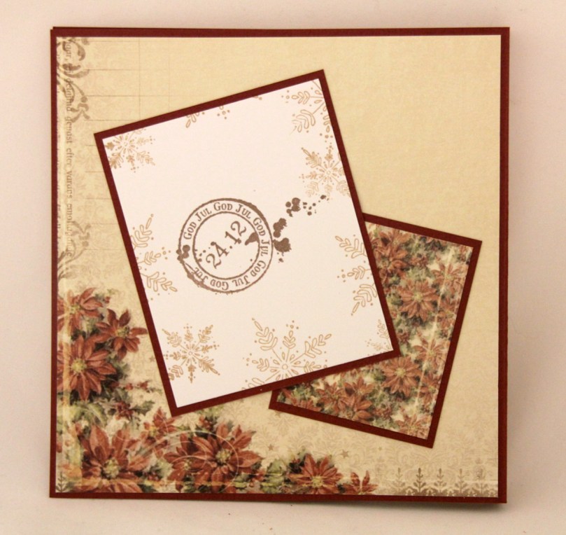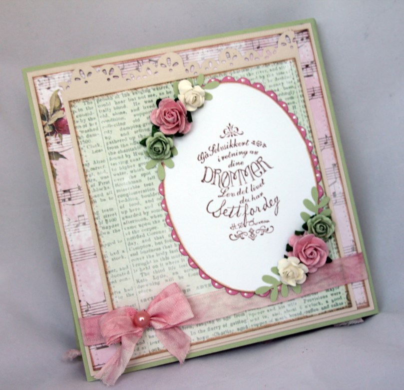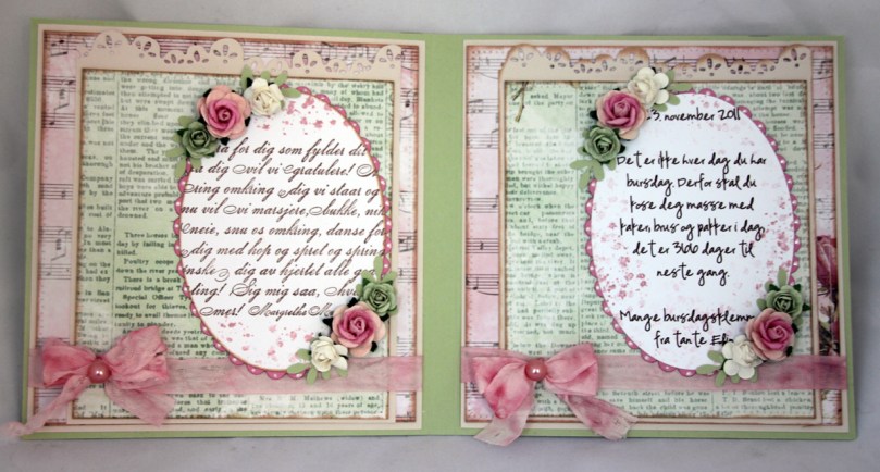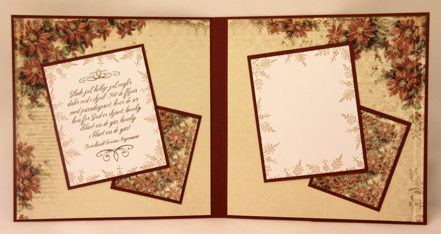 Innsidene har blitt veldig enkle i forhold til utsiden. Kan ikke lesse på med 30 blomster på hver eneste side av et kort, da blir man for det første aldri ferdig, og for det andre så vil kortet bli så tykt og tungt at det er latterlig. Som nevnt tidligere var ikke Rosa-Marina 7-arket å oppdrive i godtebutikken, så jeg fant et Pion-ark som jeg har brukt som erstatning. Både tekststempelet og stempelet jeg har brukt rundt kanten av tekstpanelene er fra Stempelglede.