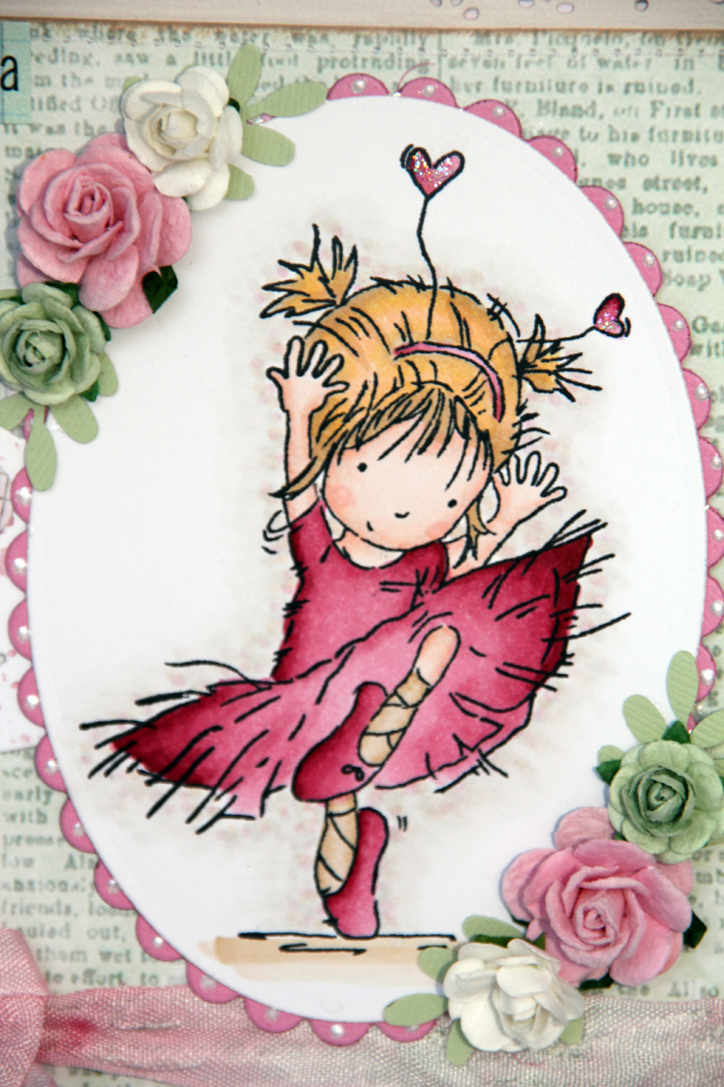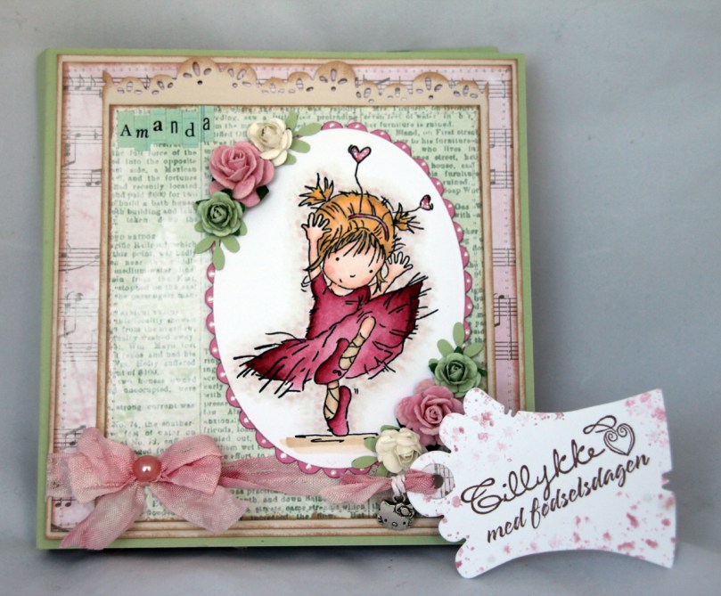 Blomstene jeg har brukt på dette kortet er en god blanding av WOC, Kort og Godt og sikkert også noe annet, rosa perlestrå og hvit perletråd fra Kort og Godt. Små perler satt litt spredt rundt omkring er fra Inkido, perlebrads fra Papirloftet. Blonden var en gammel jeg hadde liggende, pyntenålene er kjøpt på godtebutikken. Her ser du også det bittelille jeg har brukt av baksiden av “Pink Newspaper”, helt nede i høyre hjørne. Metallpynten er fra Kort og Godt.