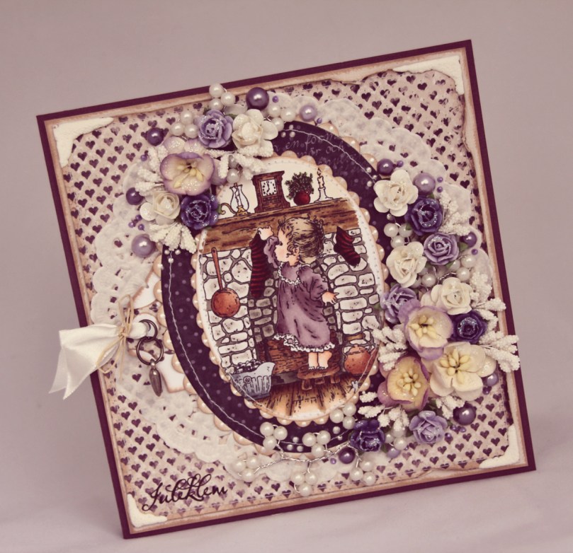 Hadde først planer om å bruke de fantastiske lilla julearkene til Magnolia på dette kortet, men jeg hadde allerede brukt de til staffelioppgaven for et par uker siden, og fant ut at det var best med noe annet. Maja Designs “Ska vi ta en Fika?”-kolleksjon har mange fine ark, og endel av dem er lilla, så jeg har derfor brukt “Plommonkaka” og “Våffla m björnbärssylt”, mønsterark med mange søte små hjerter må jo passe fint til jul??