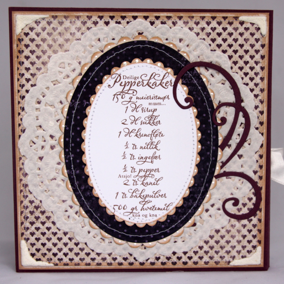 Baksiden har jeg også gjort veldig enkel. Pepperkakestempelet er fra Ladybug and Friends. Det er noe med fonten og de små tilleggsordene på dette stempelet som er herlig. Atsjo! liksom, hvem i all verden kommer på å putte det i et stempel? Genialt!! Men jeg oppdaget til min store forskrekkelse en trykkleif. Det heter da meierismør, ikke meierissmør!!! Jeg hater skrivefeil og gramatikkfeil på stempler, og er derfor veldig forsiktig når jeg kjøper tekststempler (jeg har sett MANGE og/å-feil som ødelegger stemplene helt), men denne har gått meg hus forbi.. Jaja, man kan kanskje ikke få med seg alt..