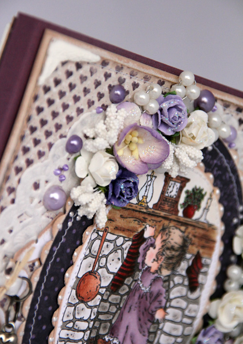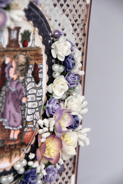 Blomstene er en blanding fra Papirdesign, Kort og Godt og Wild Orchid Crafts. Pyntegrenen med perler er fra Kort og Godt, det samme gjelder pyntebærene og perlene jeg har brukt. Har også brukt Liquid Pearls i fargene “Opal White” og “Lavender Lace”. De fleste blomstene har også blitt pyntet litt med Stickles Star Dust. Hjørnene (litt diffust på dette bildet fordi jeg har fokusert på blomstene) har fått litt snøeffekt med Liquid Appliqué som ble lagt på i tykke lag og tørket natten over, før de fikk kjørt seg med varmepistolen.