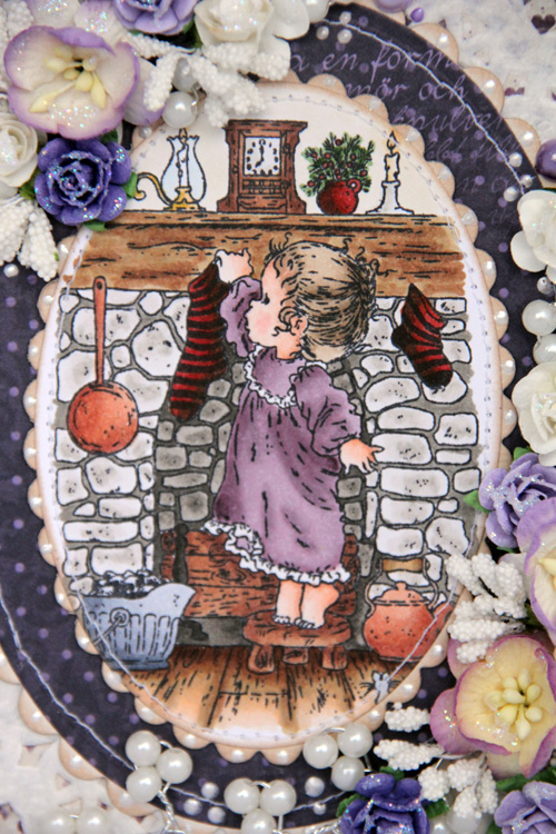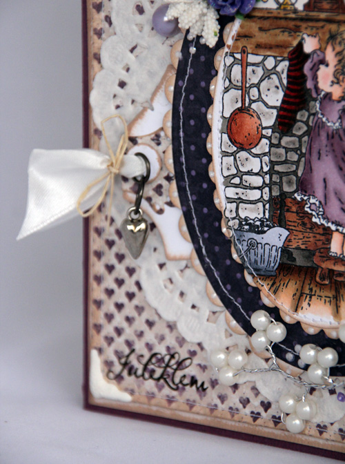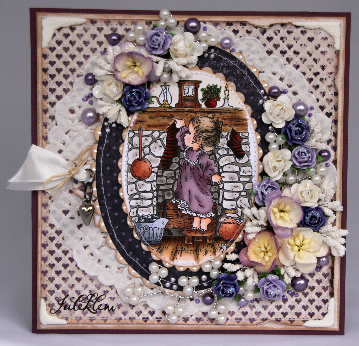 Har zoomet litt inn på tagen jeg har satt bak motivet (har glemt å ta bilde av den ute, men det er ikke mer spennende enn at det er stemplet “I den søte juletid” på den), den har fått litt silkebånd, litt Scrapper’s Floss fra Karen Foster og en hjertecharm fra Kort og Godt festet i jump rings fra Tim Holtz. Stempelet nede i venstre hjørnet kommer fra Ladybug and Friends, syns det er så genialt med sånne småtekster som man får plass til “overalt”, så jeg har endel av disse, både til jul og til andre anledninger.