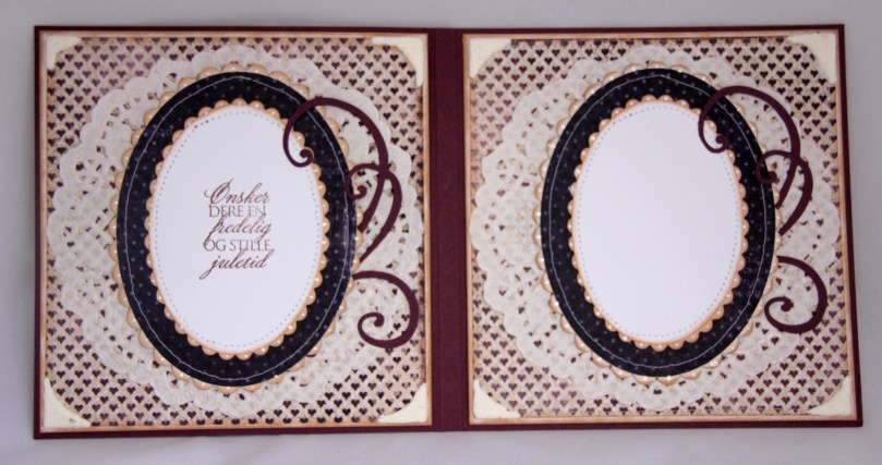 I sterk motsetning til fronten på dette kortet har jeg gjort innsidene veldig enkle. Kakeservietter fra LYB, en swirl-die fra Magnolia og litt Liquid Appliqué er alt. Stempelet på venstresiden er fra North Star Stamps, har brukt platen med disse småstemplene kjempemasse i høst. På høyresiden er det god plass til en personlig hilsen.