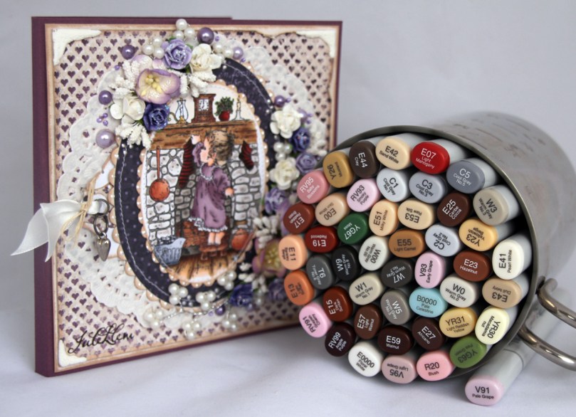 Motivet er som alltid fargelagt med Copics, bilde av fargene jeg har brukt finner du nederst i dette innlegget. Nattkjolen har jeg jukset litt med. RV90-serien passer perfekt til Magnolias lilla juleark, som jeg hadde planer om å bruke, men når jeg endte opp med Maja-papirer gikk jeg over med V90-serien når hun egentlig var ferdig fargelagt. V90-serien passer veldig bra til arkene fra Maja. Nå ble det en eller annen mellomting med dette kortet, men det får duge, fargene på blomstene matcher heller ikke helt perfekt..