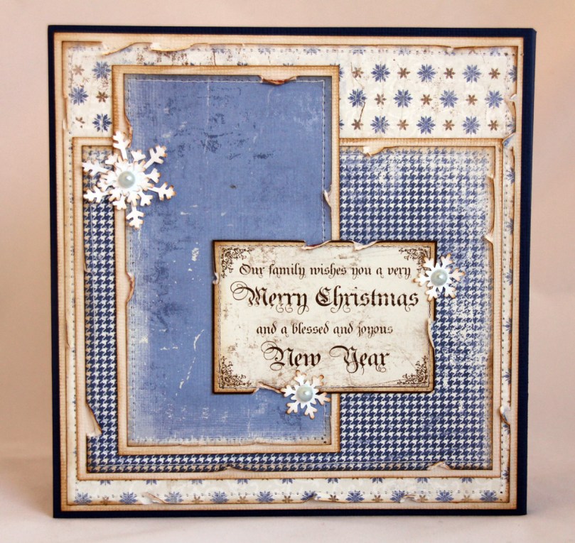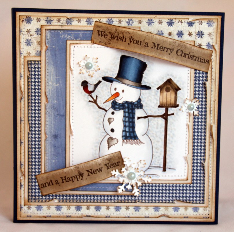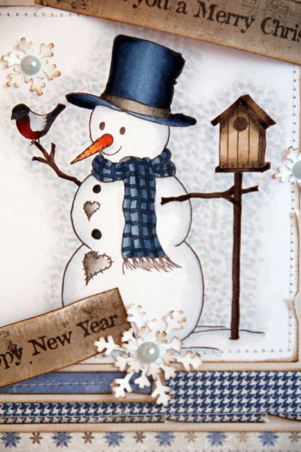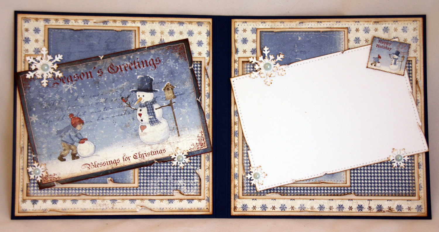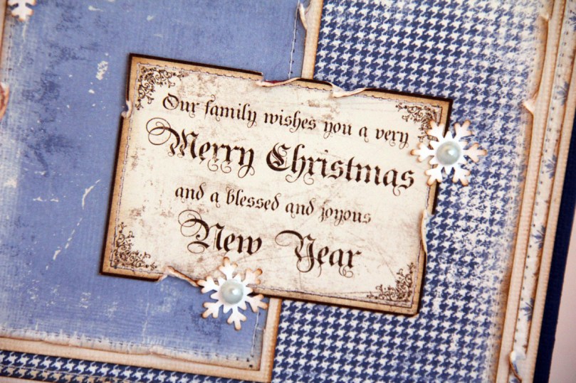 Som på forrige Nederland-kort er alle papirer fra Maja Designs nye “Vintage Winter”-kolleksjon. Motivet “Snögubben” kommer også fra Maja Design. Var mer komfortabel med dette kortet, blått og brunt er mye enklere enn rødt og blått (som egentlig er en håpløs kombinasjon å få til ordentlig). Her har jeg sydd alle paneler og svertet de med Distress ink vintage photo, men jeg har IKKE rufset kantene som jeg pleier å gjøre. Her og der har jeg riktignok revet litt i kantene for at kortet ikke skal bli så kjedelig og flatt (min tante blir sikkert veldig fornøyd med portoen på disse kortene). Noen snøflak punchet ut med MS-puncher, og noen perler fra Inkido er all pynt dette kortet får. Det er tungt nok likevel…