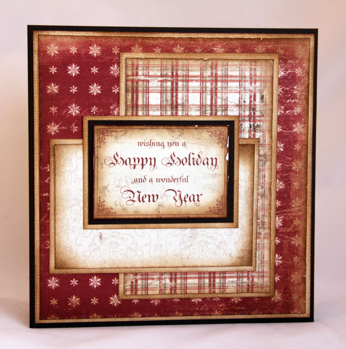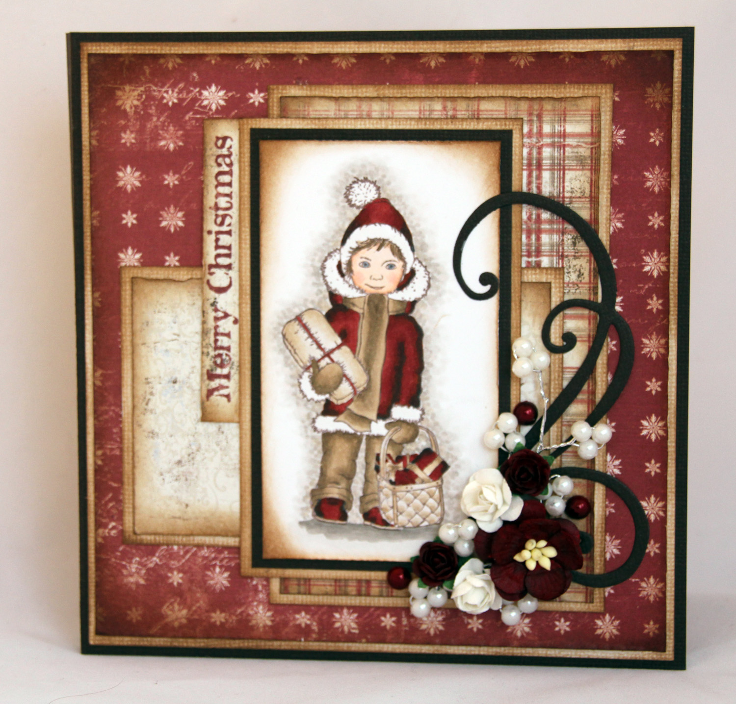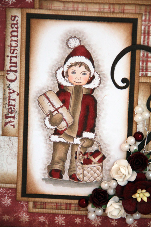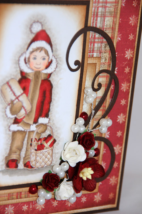 Som på de andre Nederlandskortene er papirene og motivet “Charlie med klapp” fra Maja Designs “Vintage Winter”-kolleksjon. Her er ingen paneler verken sydd eller rufset, men de er alle svertet med distress ink vintage photo. Når jeg sier at ingen paneler er rufset er det en sannhet med pluttifikasjoner (evt. modifikasjoner), jeg har brukt “Yasmin”-metoden med å legge neglen under arket og dra, så HELT flatt er ikke kortet.. Blomster fra Papirdesign, Kort og Godt og WOC. De røde blomstene var etter min mening altfor røde, så jeg har farget de med E19 i tillegg, da ble de så fine atte!!! Den hvite perlegrenen kommer fra Kort og Godt, mens perlene er fra Inkido. Swirlen er en Magnolia Doohickey-die.