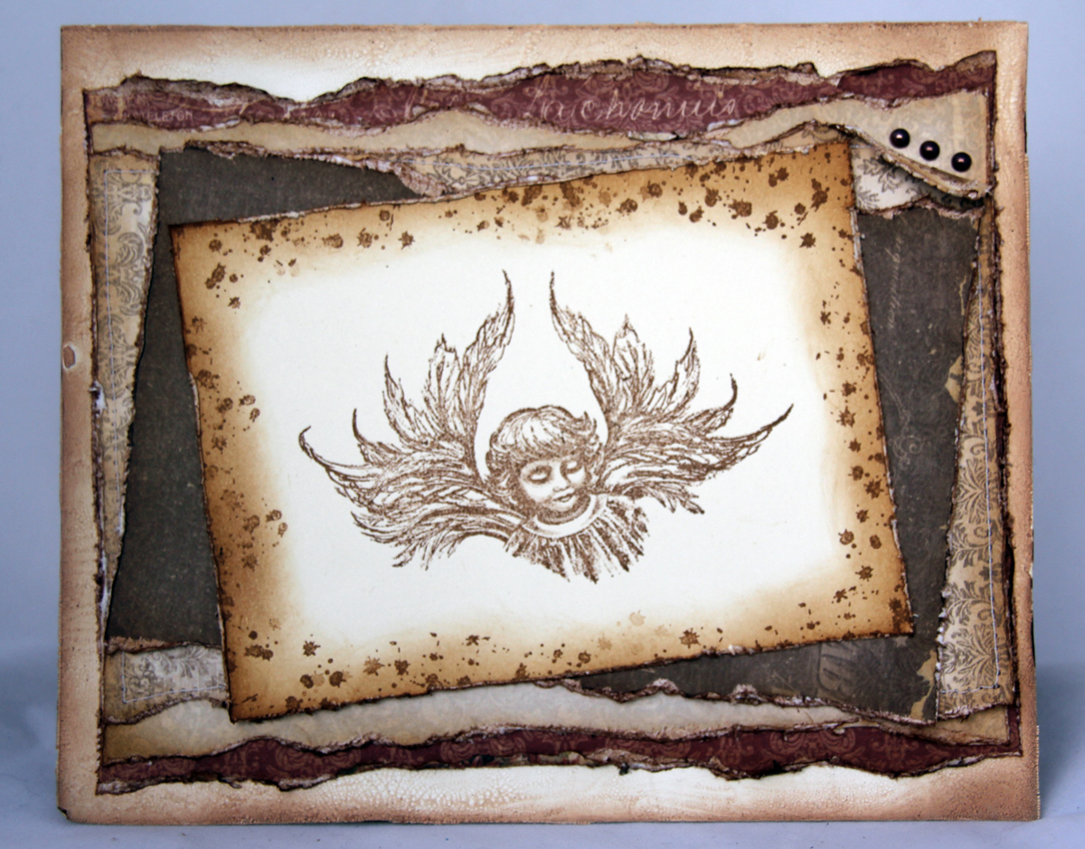 Baksiden lik som resten. Har brukt “Splash”-stempelet her også, i tillegg til et englestempel fra Stempelglede. Fant ut at jeg like godt kunne bruke engel bak når jeg allerede hadde en engel foran. Perlene jeg har brukt er fra Kaisercraft.