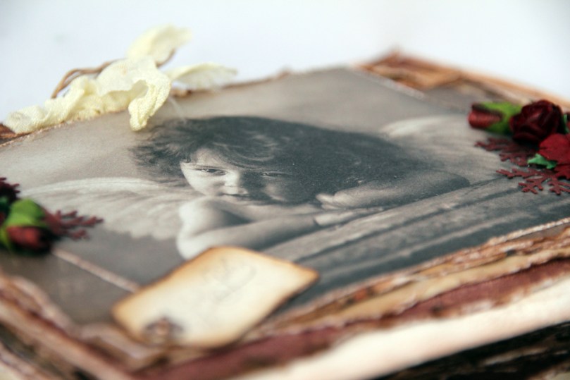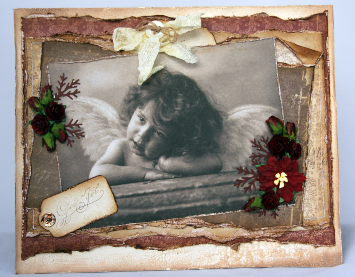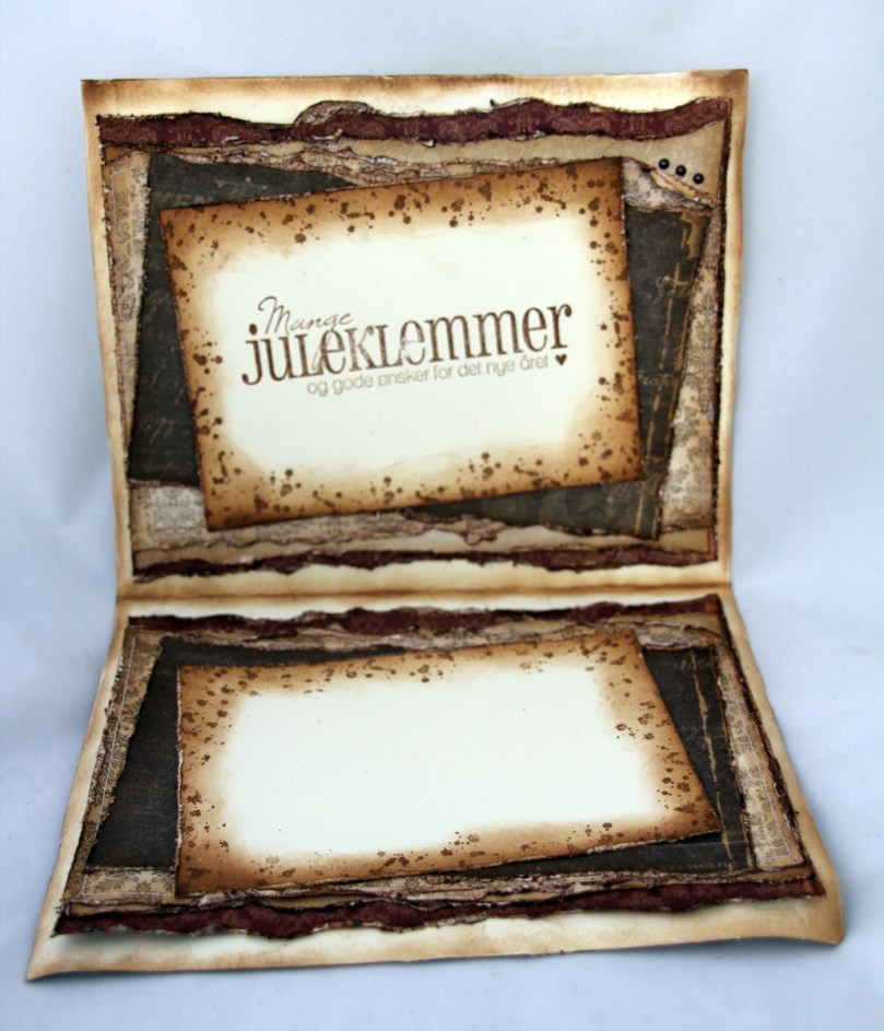 Julestjernen jeg har brukt på fronten av dette kortet er fra Papirdesign, men jeg syns den var altfor rød, så den ble farget med E19, da ble den mye finere!!! Det samme gjelder rosene, jeg tror de også er fra Papirdesign. Roseknoppene er jeg ikke sikker på, de var i utgangspunktet hvite, før også de fikk en omgang med E19. Trykknappen som er satt på den lille tagen har jeg drøssevis av, den er egentlig sølvfarget, men med litt Copic ble den “rusten” og passende til kortet. Seam binding i fargen creme med en knapp fra MF og litt hyssing på tagen som er gjemt bak motivet. Ser du nøye nederst kan du kanskje se at jeg har brukt store mengder crackle paint picket fence som jeg har tatt stempelsverte vintage photo på når malingen tørket.