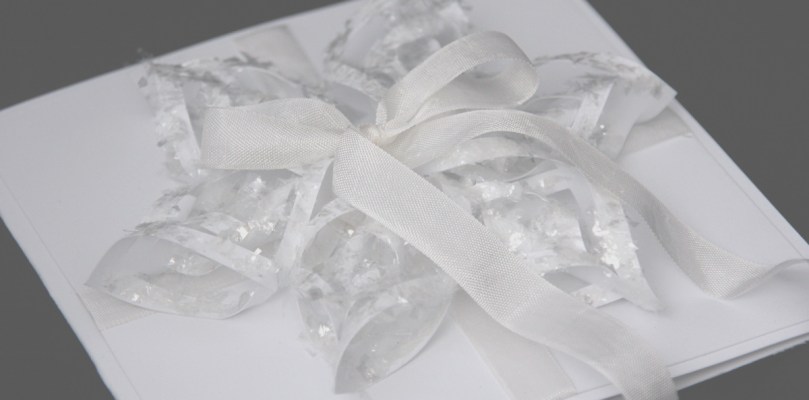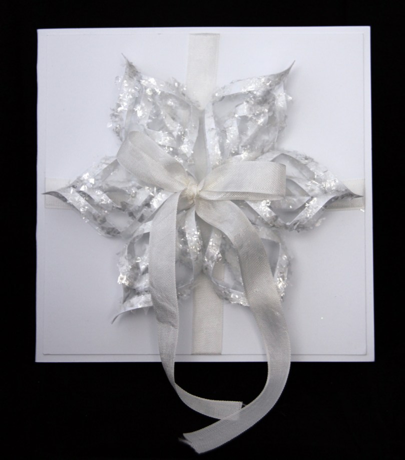 Baksiden av kortet er “undersiden av pakken” og har derfor ingen sløyfe. Krysset med båndet har derfor kun fått et snøflak i kartong stanset ut med en Sizzix-die dekket med mica flakes over seg.