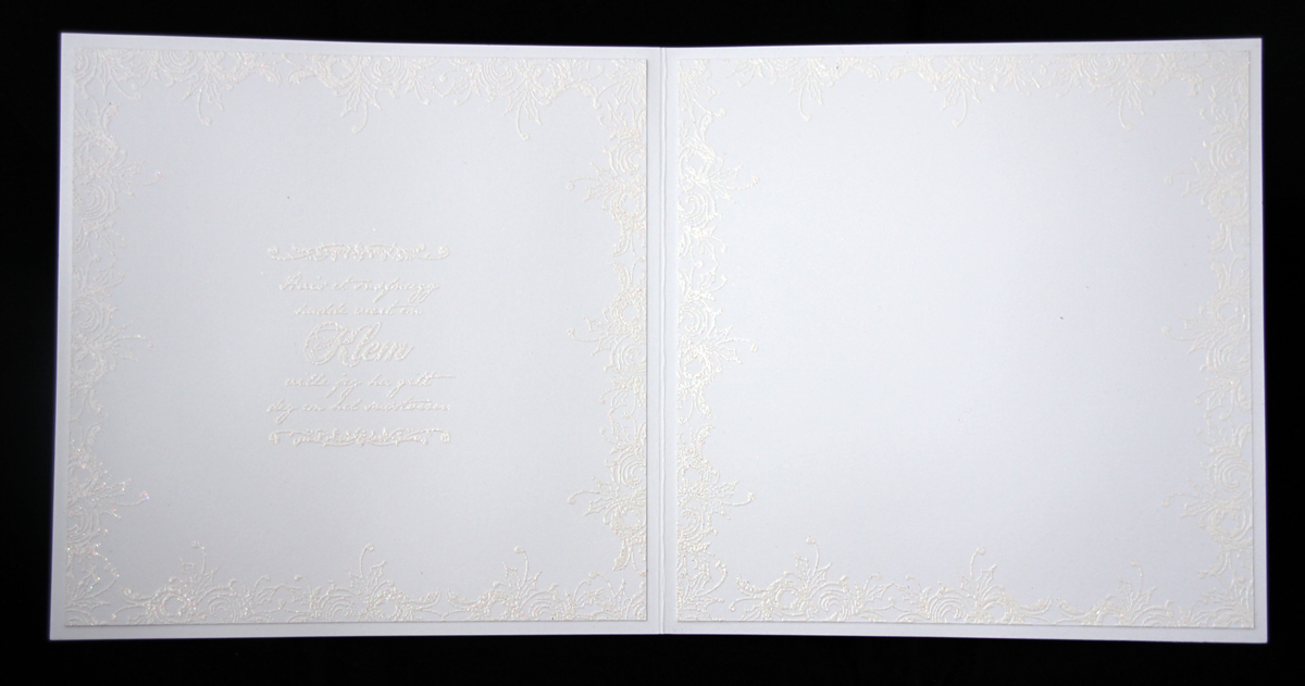 Det er litt vanskelig å ta bilder av helt hvite kort, men innsidene er stemplet med et kantstempel (kristtorn) fra Stempelglede, og venstrepanelet har fått tekst fra Kort og Godt. Begge innsidene har blitt embosset med Inkidos Frost-embossingpulver.
