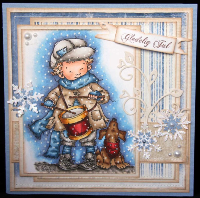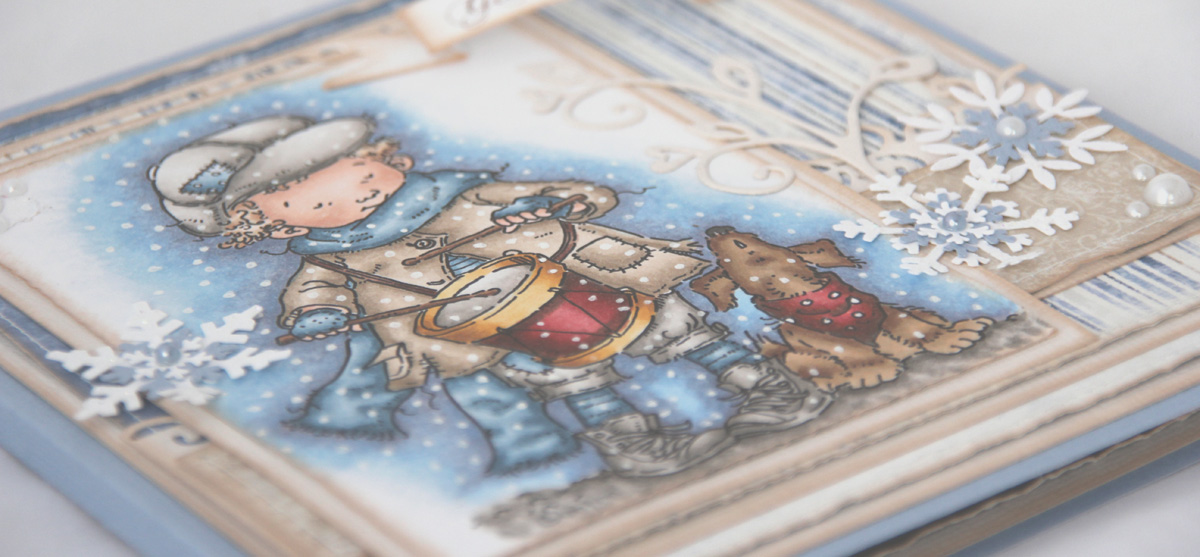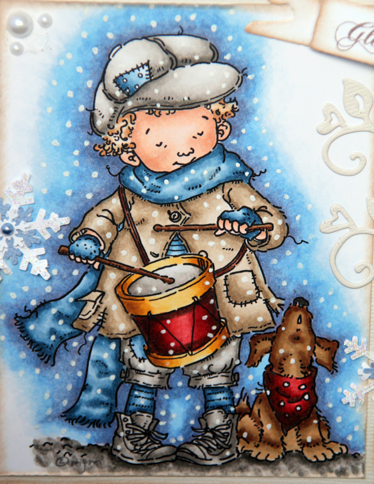 Som alltid er motivet (denne gangen “Shall I Play for You” av Mo Manning) fargelagt med Copics. Fargene jeg har brukt kommer nederst i innlegget. Har også brukt min “Pilot Super Color White Marker Pen” (extra fine) til å lage snøfnuggene mine, det er min favorittpenn i hvitt, det finnes ikke noe bedre.