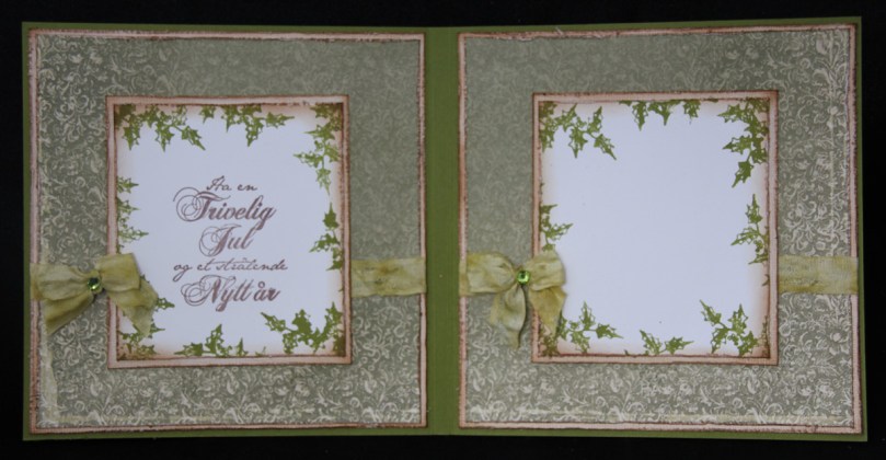 Simple insides. The same patterned paper, along with hug snug seam binding in winter white colored with YG97, 95, 93, and 91. The stamp with the holly leaves from Stempelglede is stamped around the edges with distress stain peeled paint. The text is a stamp from Kort & Godt, the bling is also fron Kort & Godt.