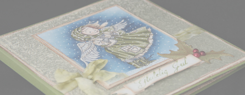 The patterned paper is “Christmas tree” from Pion Design, I stocked up on this collection (Waiting for Santa II) early this fall, and I’ve got a few sheets left, but not much. Tattered banner from TH, stamp from North Star Stamps stamped with distress stain peeled paint. I was sure I had a distress ink pad with peeled paint, but no such luck. The leaves I’ve made with a Sizzlitz die (Festive Greenery), also from TH. The cardstock used to make the leaves is coredinations crushed olive from Tim Holtz’ distress collection. The pearls are from Inkido.