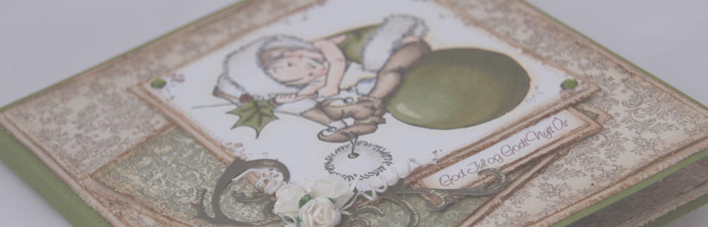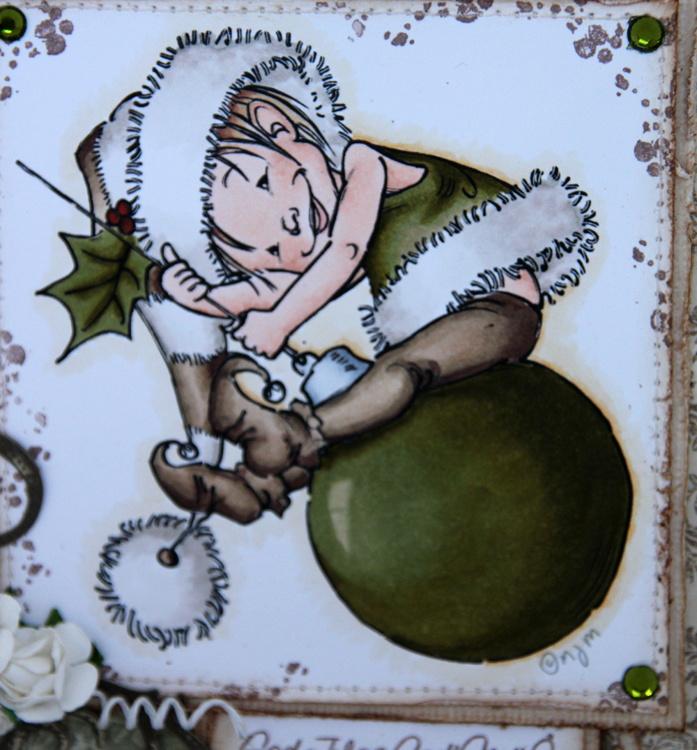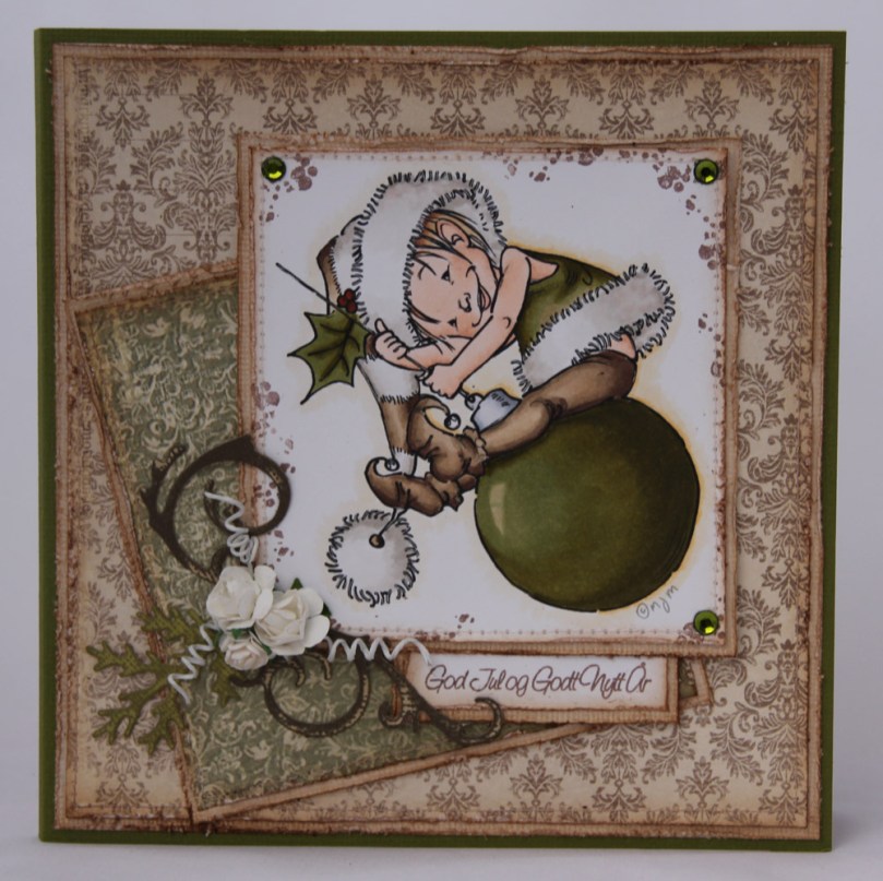 Jeg blir heller ikke lei av å lage kort med motiv fra Mo Manning. Denne gangen er det “Little Elf Finn” i kombinasjon med arkene “Vinterlek” og “Julgran” fra Pion Design (Väntan på tomten II). Tekststempelet kommer fra North Star Stamps, bling fra Kort og Godt. Ellers på kortet har jeg maskinsøm og kanter som er rufset og deretter svertet med Vintage Photo.