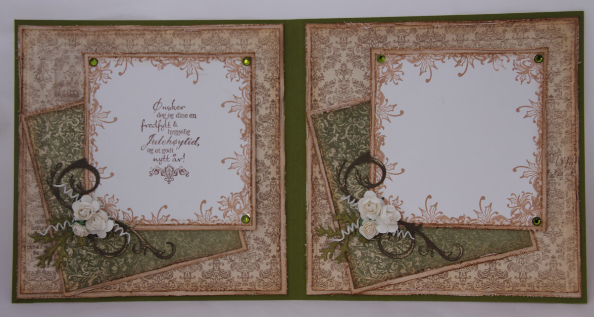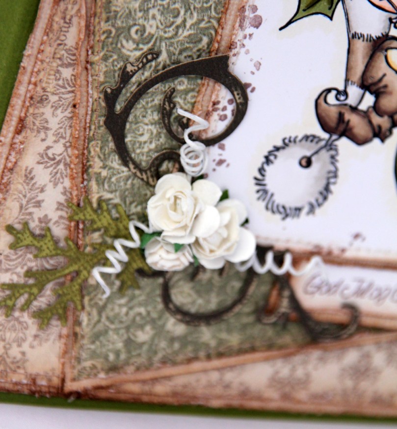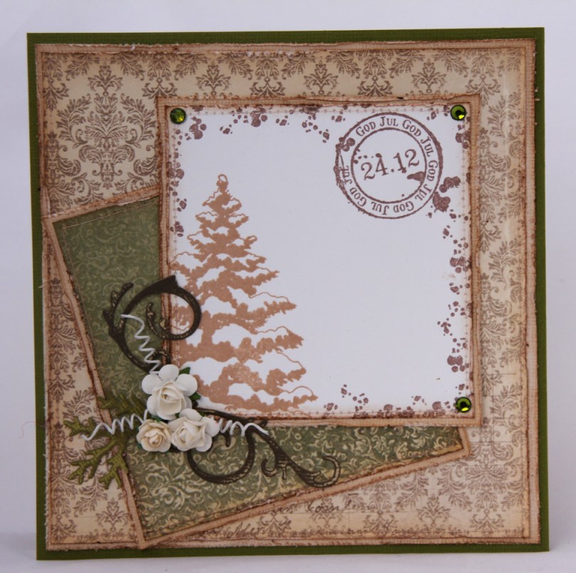 Har stanset ut deler av Tim Holtz’ Festive Greenery die i coredinations walnut stain og crushed olive. Har gått over disse med sandpapir, det blir en beskjeden pynt på kortet sammen med tre hvite roser fra Kort og Godt og tre hvite snurrer, også de fra Kort og Godt.