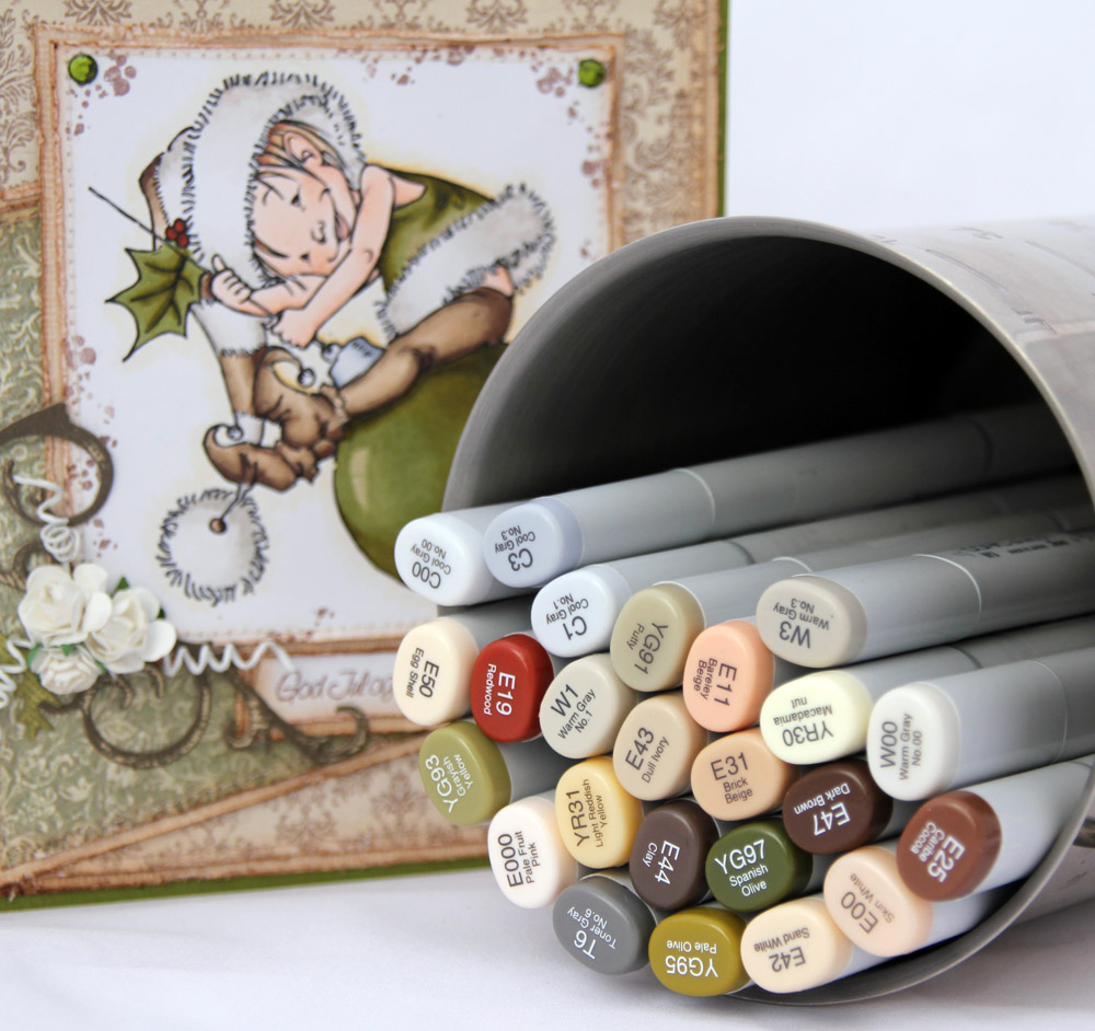 Motivet er fargelagt med Copics, som vanlig kommer fargene i bunnen av innlegget. Langs kantene på motivet har jeg stemplet deler av 24.12-poststempelet til Inkido med Memento Rich Cocoa.