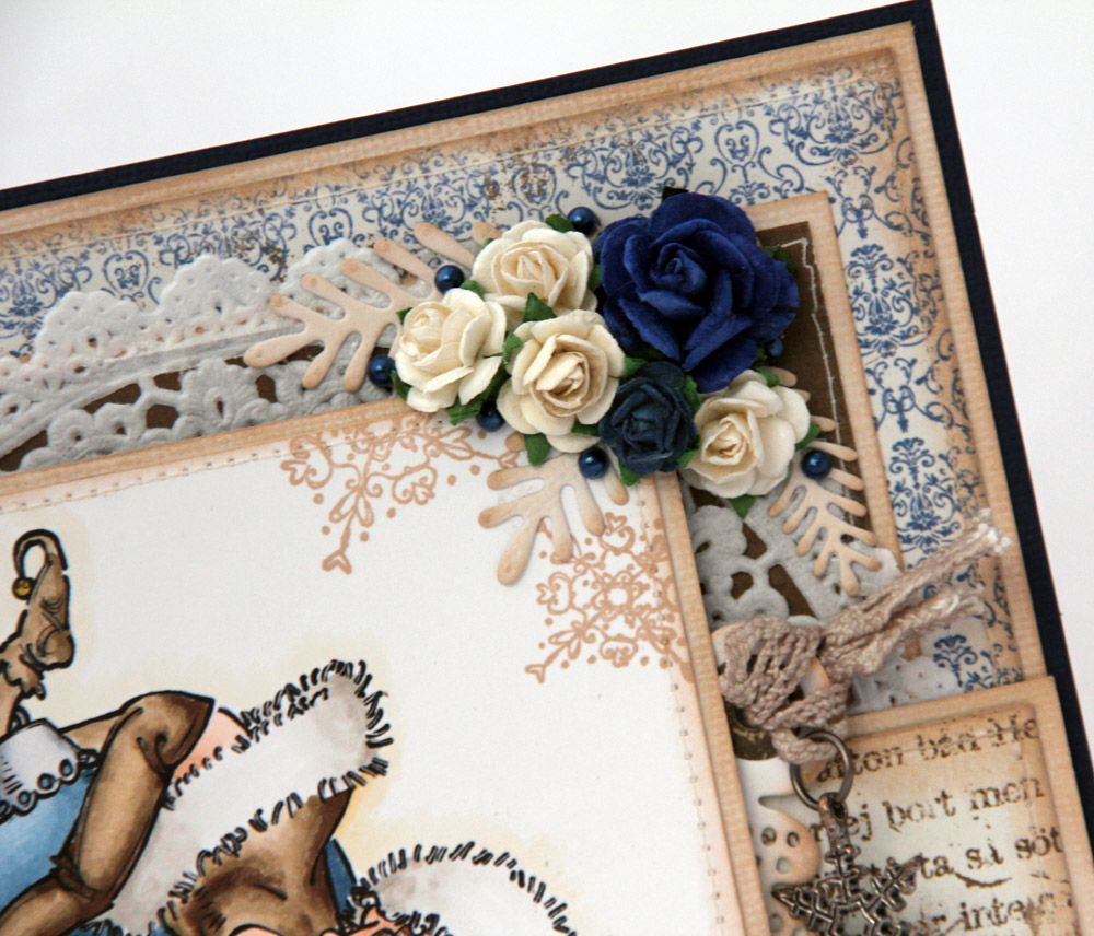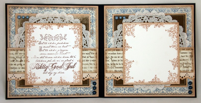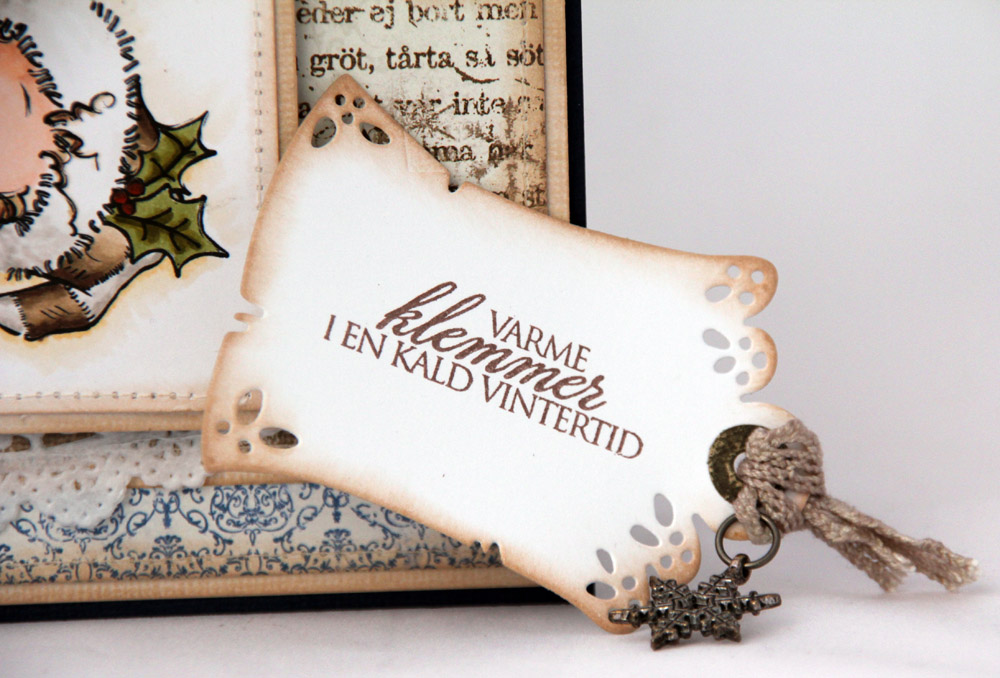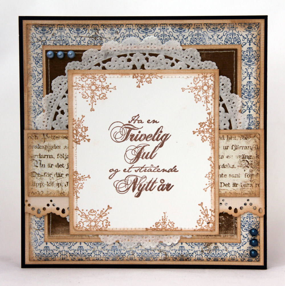 Papirer jeg har brukt på dette kortet er fra Maja Designs Vintage Winter-kolleksjon. Har brukt arkene “Skicka en hälsning” (begge sider av arket) og “Snön faller”. Alle kanter er svertet med creamy brown, den samme fargen har jeg også brukt på snøflakene som jeg har stemplet i hjørnene. Kvistene er stanset ut med en Magnolia-die, kakeserviett kommer fra Panduro. Perlene er fra Inkido, og charmen fra Kort og Godt.