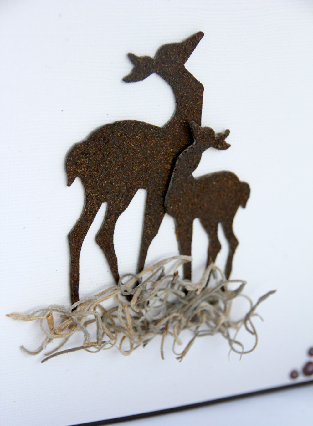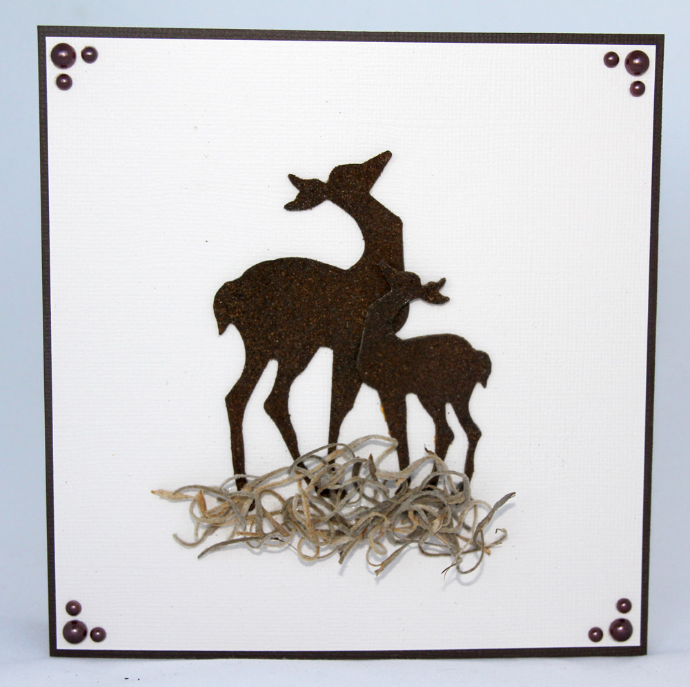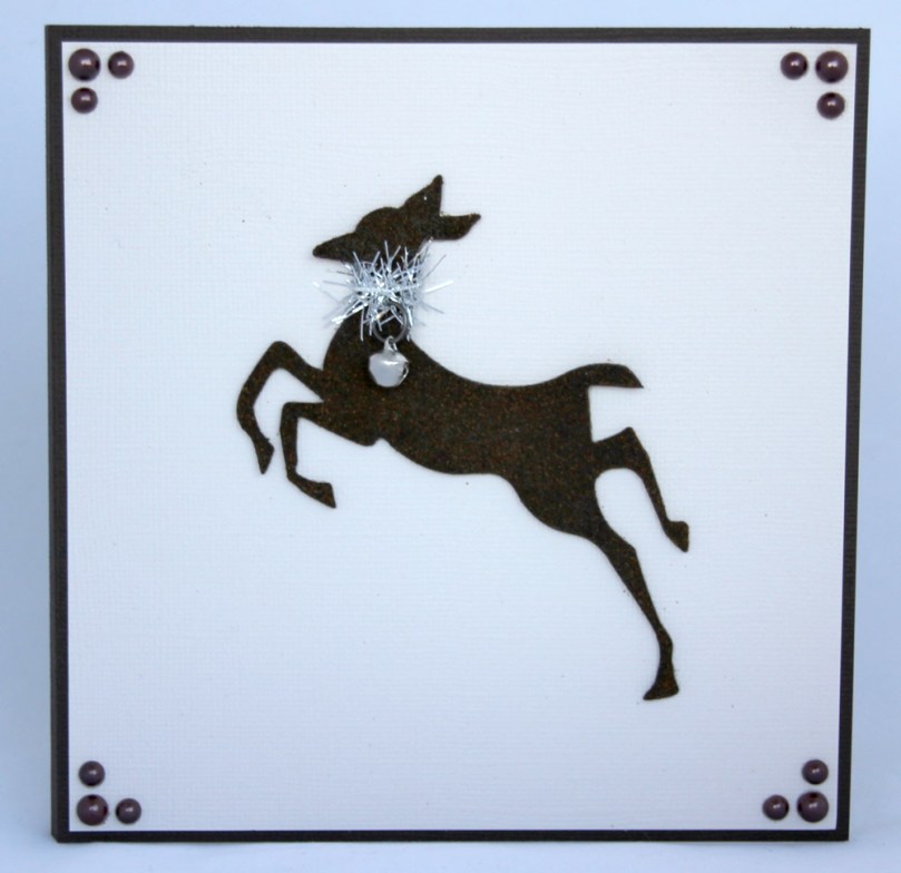 Jeg merker veldig tydelig selv at når jeg lager kort med fargelagte motiv blir det mange lag på lag og masse stæsj, men når jeg IKKE fargelegger motiv til å ha på kortene mine, da blir de veeeeldig enkle. Dette er da et eksempel på sistnevnte. Kun et reinsdyr stanset ut i grungeboard farget med vintage photo og embosset med distresspulver i samme farge. Tre perler i hvert hjørne fra Kaisercraft og noe pynt rundt halsen og dett var dett.