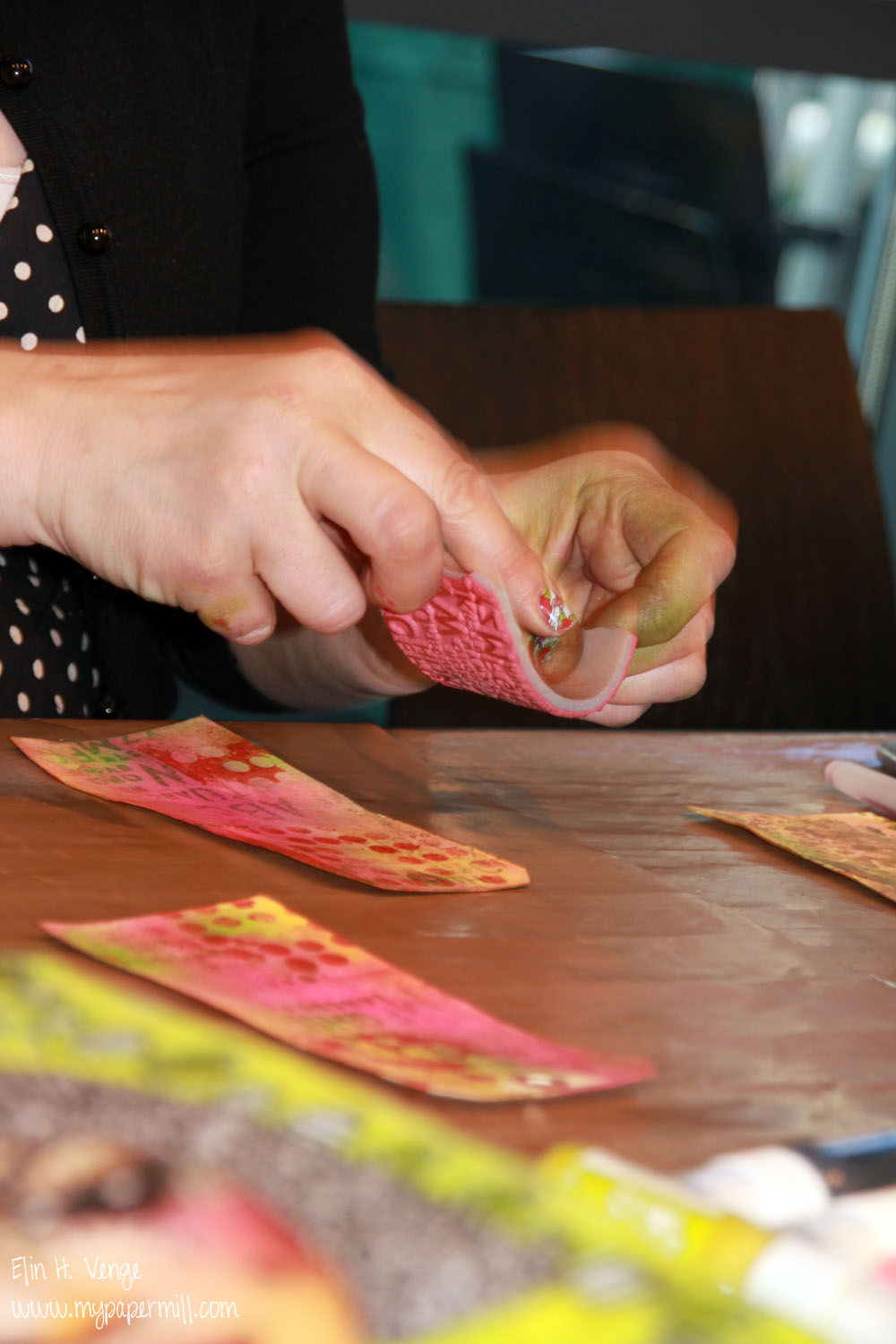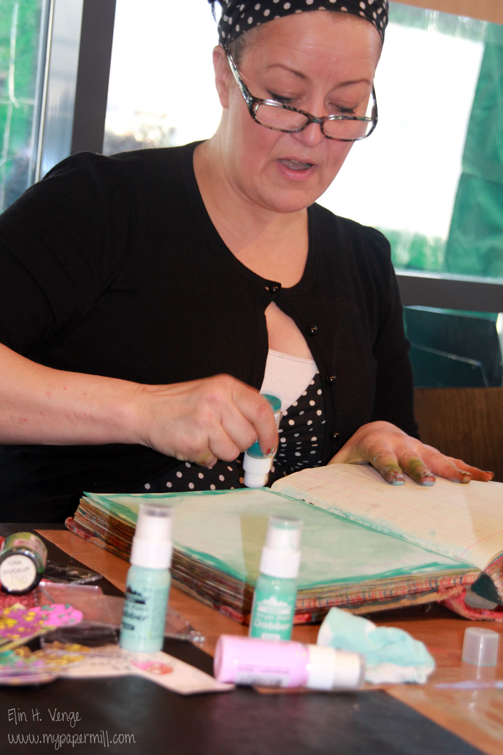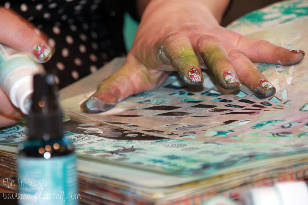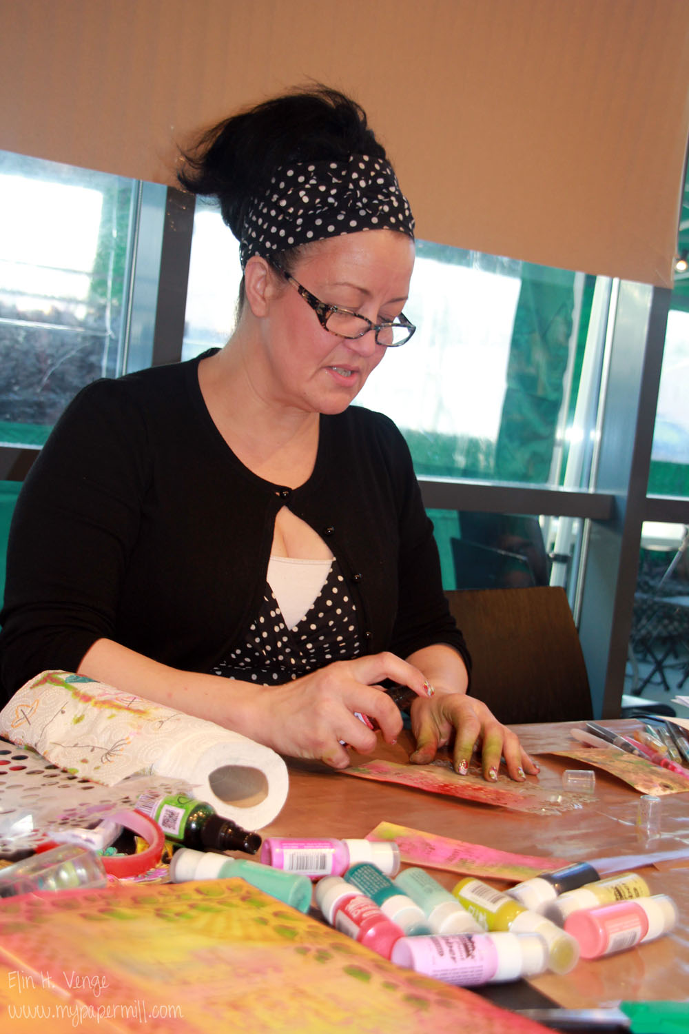 Dessverre har jeg bare bilder av innspurten av tagproduksjonen hennes og ikke hele, men jeg var så bergtatt de første 15 minuttene at jeg helt glemte å ta frem kameraet. Liten oppsummering av de første 15 likevel: spraying av vann, colorwash, dylusions og mer vann på en tag før hun la en annen tag oppå og klæsjet de ordentlig sammen, dro de fra hverandre og klappet den store tørkerullen pent på begge to så de skulle tørke. En tredje tag ble dratt i resten av malingen på underlaget for at ingen maling skulle gå til spille, hun bruker virkelig så mye som mulig, det er helt vilt å se på!! Hun brukte et stempel med mange prikker i som hun stemplet med rødt, hun satte det ikke på noen akrylkloss eller noe, for hva er vel gøy med det? Her bøyes stempelet i fingrene og stemples flere ganger over tagene uten å dynke stempelet noe mer i stempelputen, da blir trykket forskjellig hver gang og man får ”renset” stempelet i samme slengen. Rensing av stemplene på gamlemåten er noe hun ikke bryr seg om, hun vil heller leke enn å vaske. Gal dame på en veldig fornuftig måte!! Stensiler ble brukt med en veldig kul grønnfarge (Dylusions Cut Grass), og for at ingenting av det dyrebare blekket skulle gå til spille brukte hun selvfølgelig det negative også!!