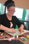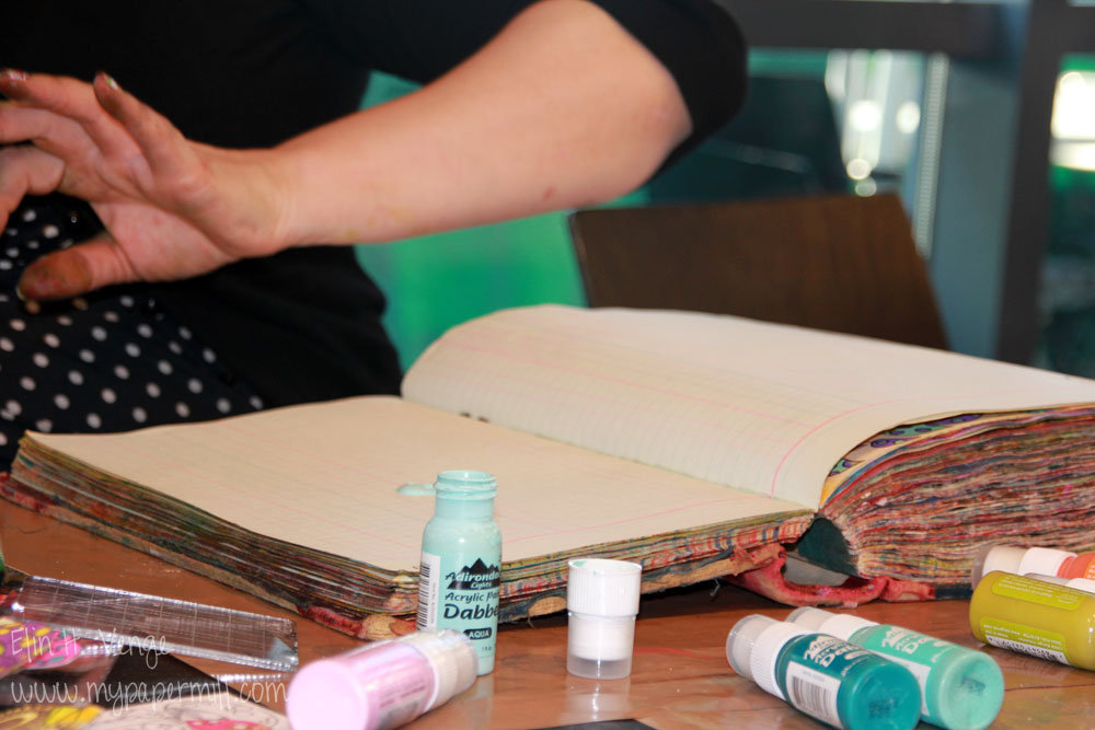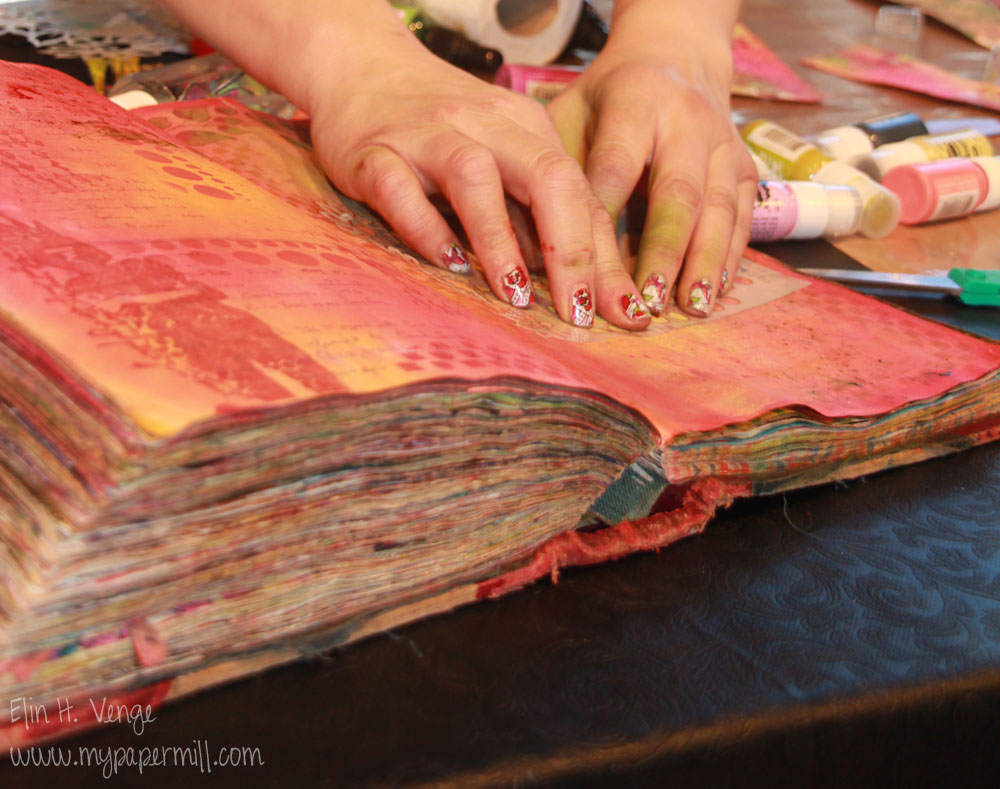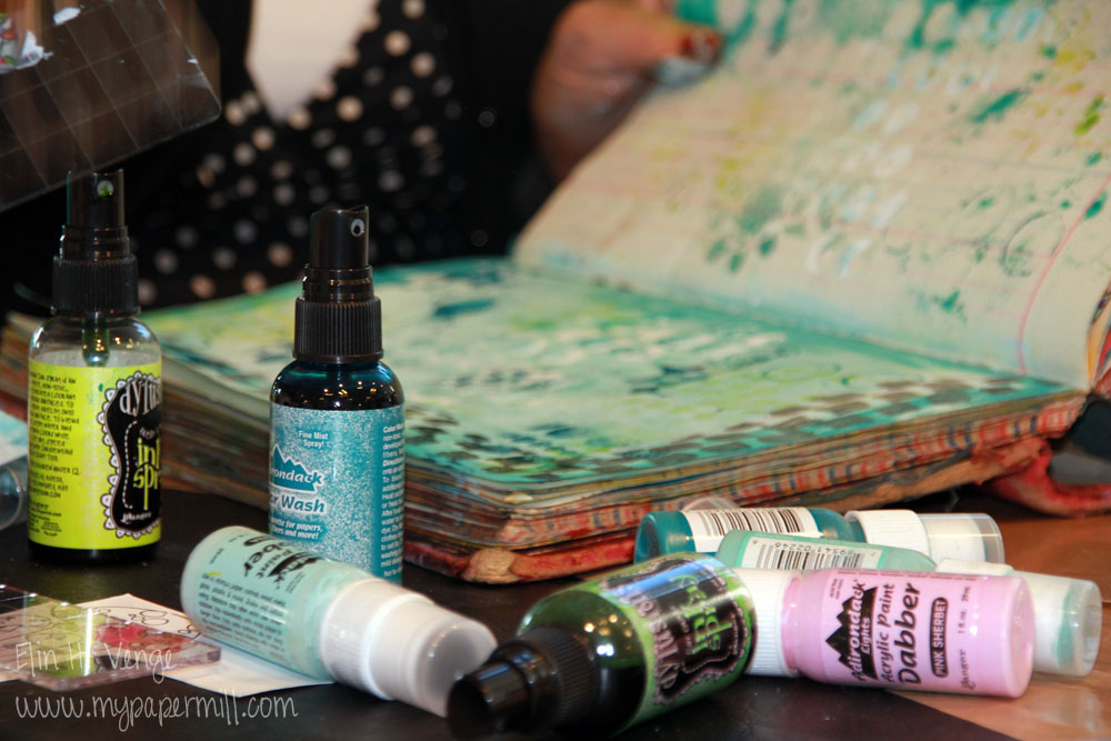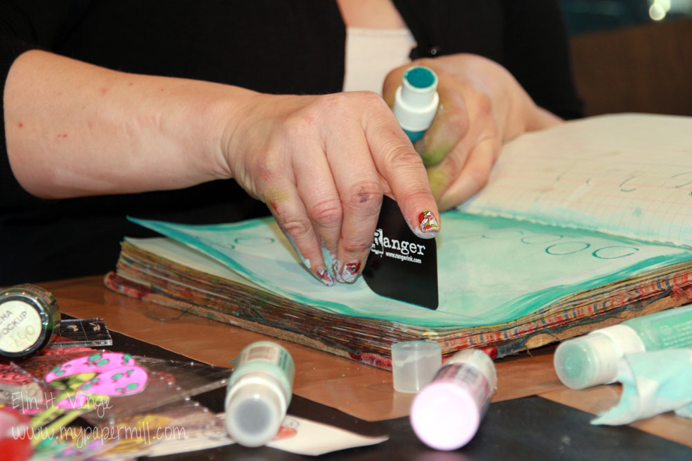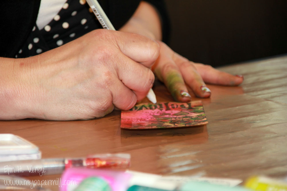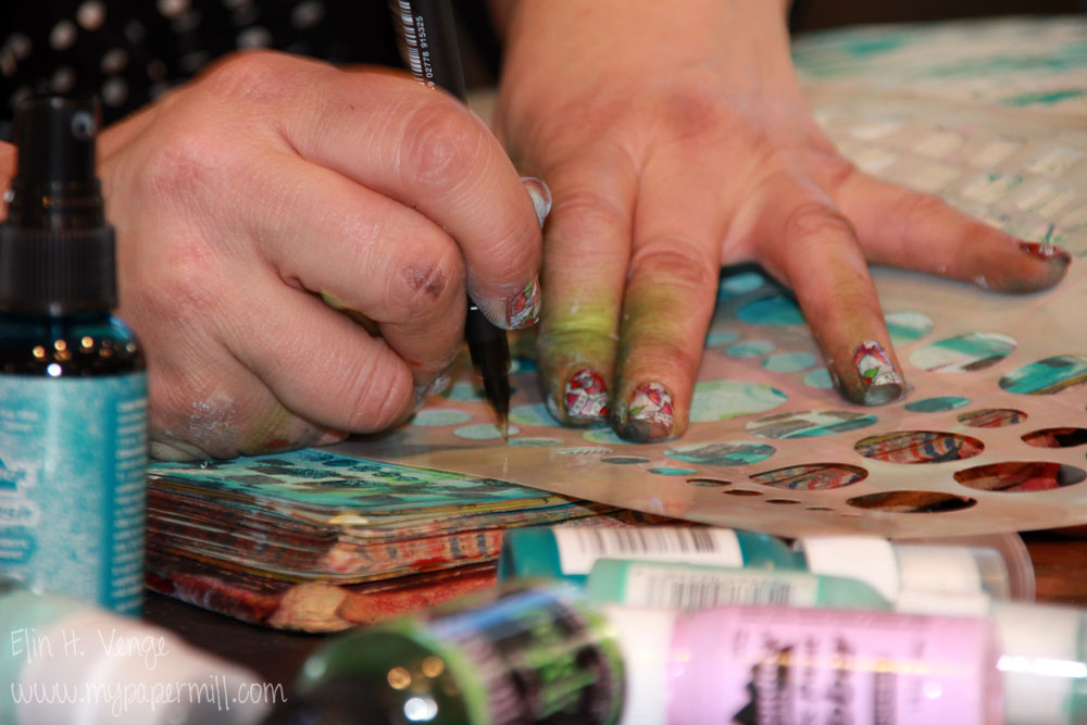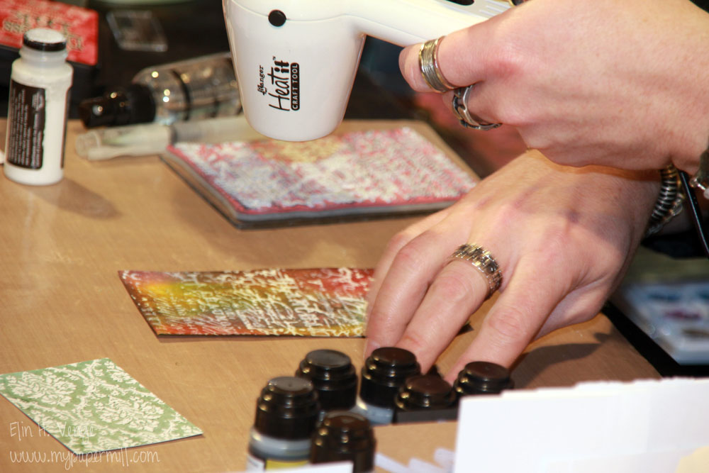 Dessverre har jeg bare bilder av innspurten av tagproduksjonen hennes og ikke hele, men jeg var så bergtatt de første 15 minuttene at jeg helt glemte å ta frem kameraet. Liten oppsummering av de første 15 likevel: spraying av vann, colorwash, dylusions og mer vann på en tag før hun la en annen tag oppå og klæsjet de ordentlig sammen, dro de fra hverandre og klappet den store tørkerullen pent på begge to så de skulle tørke. En tredje tag ble dratt i resten av malingen på underlaget for at ingen maling skulle gå til spille, hun bruker virkelig så mye som mulig, det er helt vilt å se på!! Hun brukte et stempel med mange prikker i som hun stemplet med rødt, hun satte det ikke på noen akrylkloss eller noe, for hva er vel gøy med det? Her bøyes stempelet i fingrene og stemples flere ganger over tagene uten å dynke stempelet noe mer i stempelputen, da blir trykket forskjellig hver gang og man får ”renset” stempelet i samme slengen. Rensing av stemplene på gamlemåten er noe hun ikke bryr seg om, hun vil heller leke enn å vaske. Gal dame på en veldig fornuftig måte!! Stensiler ble brukt med en veldig kul grønnfarge (Dylusions Cut Grass), og for at ingenting av det dyrebare blekket skulle gå til spille brukte hun selvfølgelig det negative også!!