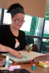 Hun snudde stensilen og brukte fargen som satt oppå til å trykke nedi siden i AJ-en for å fortsette på en gammel bakgrunn. Da ble blekket brukt opp og AJ-bakgrunnen kom ett skritt videre!