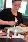 Det er ingen tvil om at dama er rotete, men jeg tror det er de mest rotete hjernene som også er de mest kreative, alt skal ikke være ryddig og perfekt, hva slags kreativitet kan komme ut av det?? Oppi alt rotet mistet hun ”skraperen” sin, så Alain (Ranger-sjef) måtte løpe og hente en ny en. Denne dro hun veeeldig sakte over toppen på dabberflasken. ”It’s not a credit card machine”, var ordene hun brukte, drar du for fort blir svampen på toppen ødelagt, og det vil vi ikke ha noe av. Så dro hun skraperen, nok en gang veeeeeeldig saaaakte nedover arket for å lage en stripe. Alt den dama finner på!! Jeg skjønner etter fredag at linjen mellom galskap og geni er ganske så tynn og holder på mitt: hun er GeniAL!!