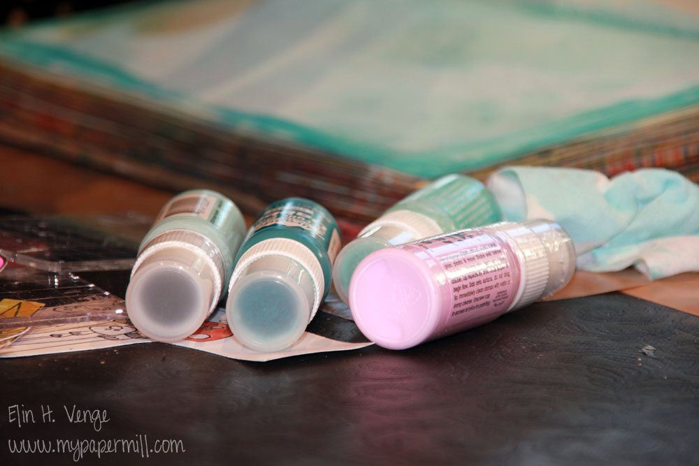 Varmepistol så den tørket litt fortere og ink blending tools i et par forskjellige farger et stykke inn på tagen.