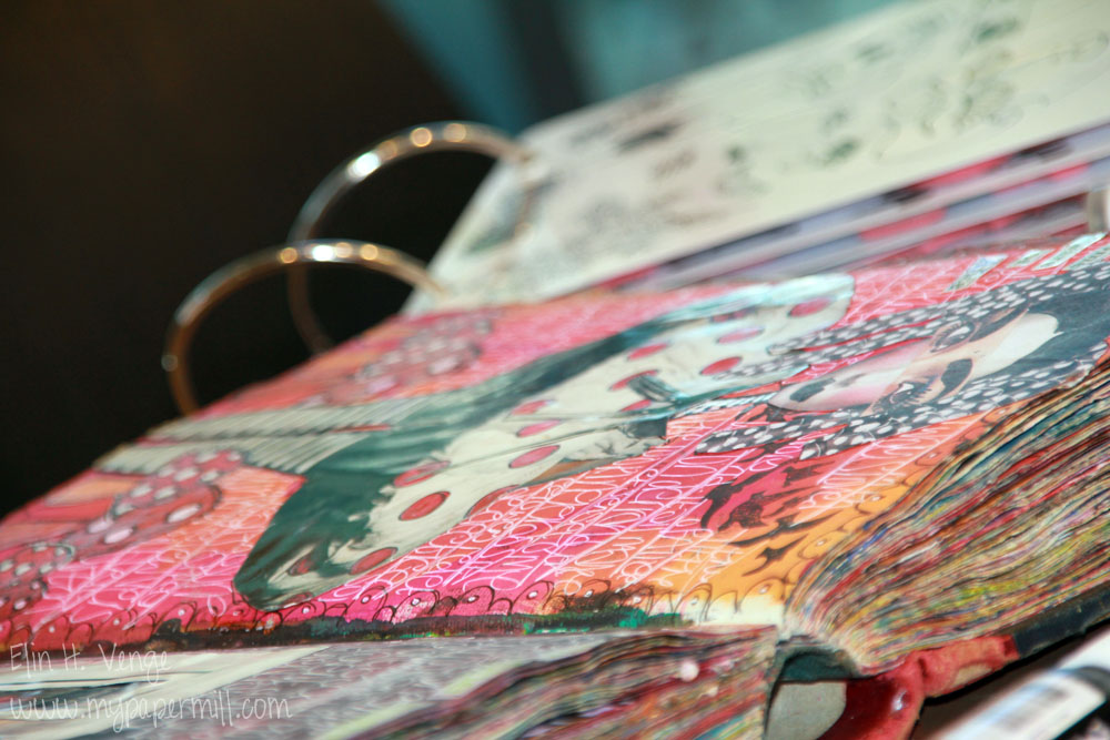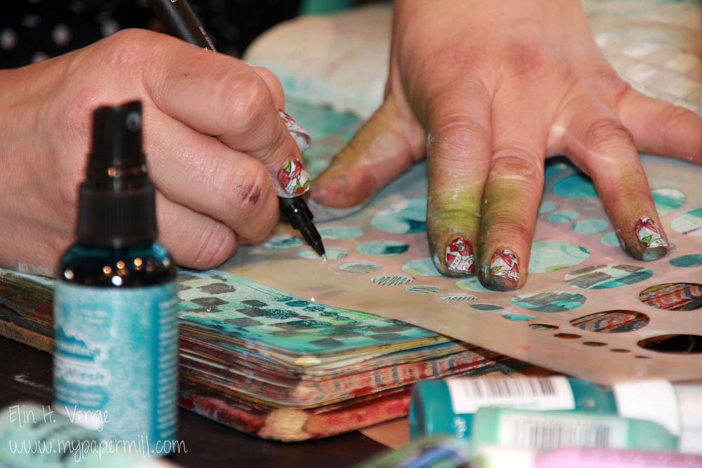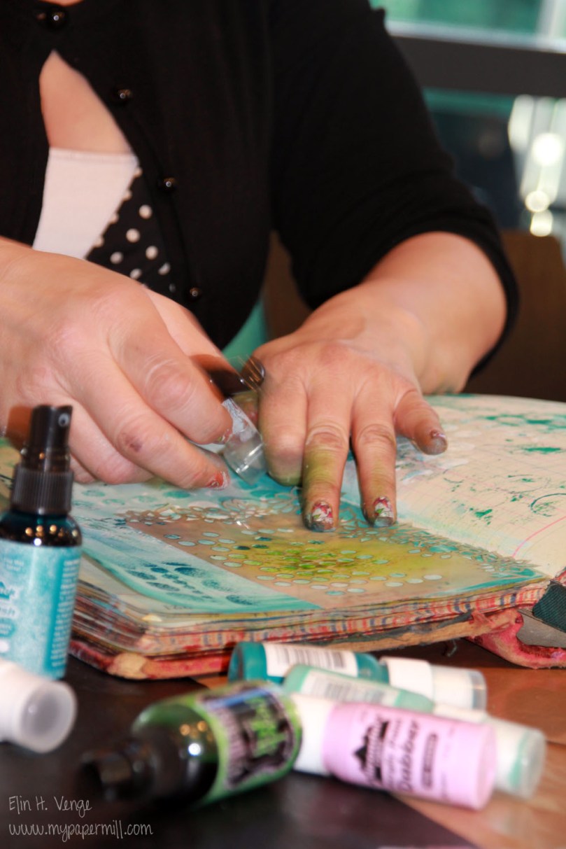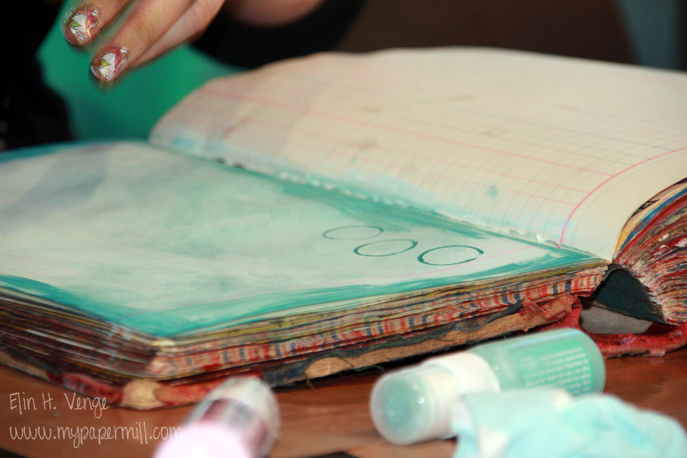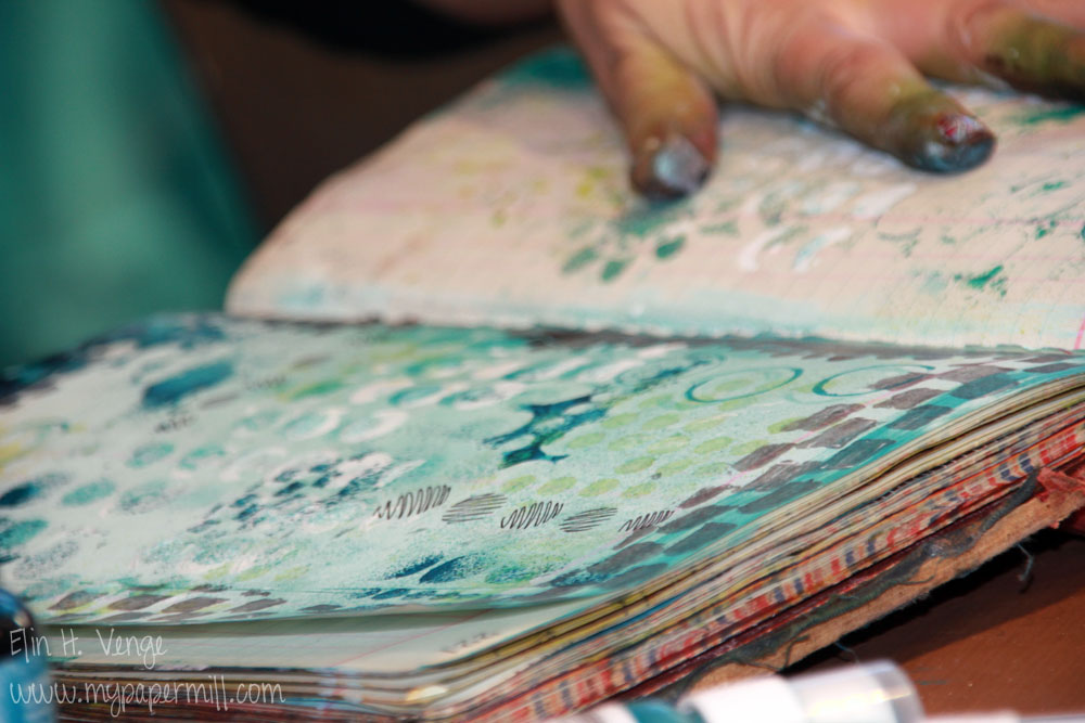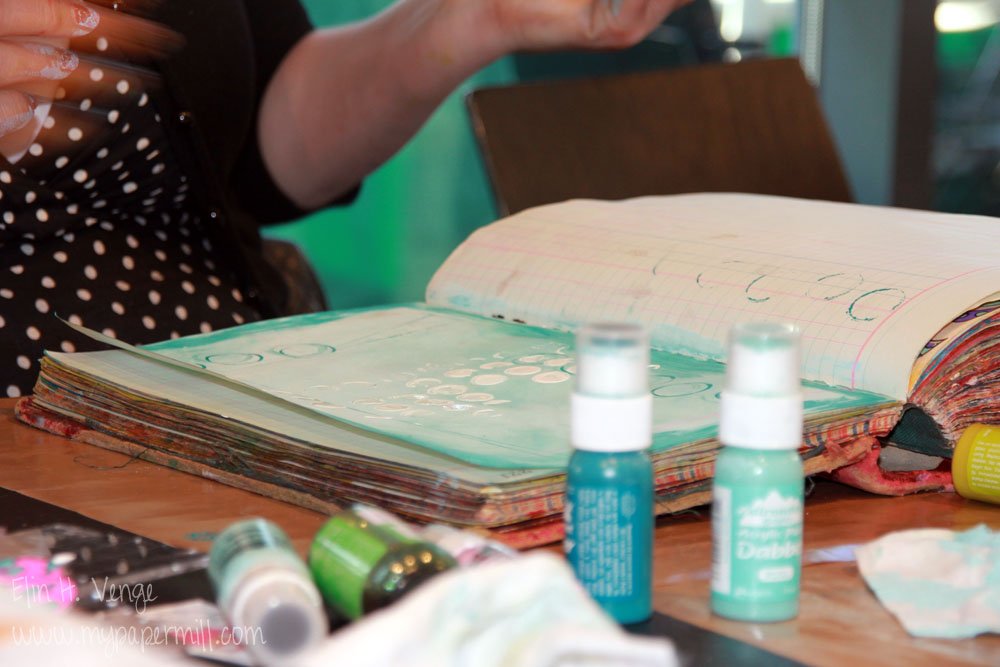 En stor stensil med sirkler ble brukt for å ”dytte på plass” litt Gesso. Grunnen til at hun brukte Gesso og ikke hvit dabber var for at hun ville få litt struktur på siden, hvit dabber ville ha endt opp med å bli like flatt som resten av dabberne. Resten av gessoen på stensilen ble selvfølgelig brukt et annet sted i boken, dyttet på plass med våtserviett. Våtservietten ble så brukt på en annen side for å gni farge inn på siden (fra Aqua-fargen fra tidligere). Her brukes ALT.