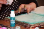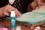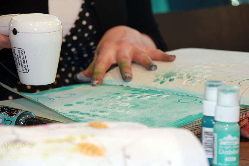 Stensilen ble flyttet litt på og så ble det sprayet med litt Dylusions Vibrant Turquoise før hun brukte varmepistolen for å tørke det hele litt for å speede opp prosessen, det går kjapt i svingene når hun kommer i gang!