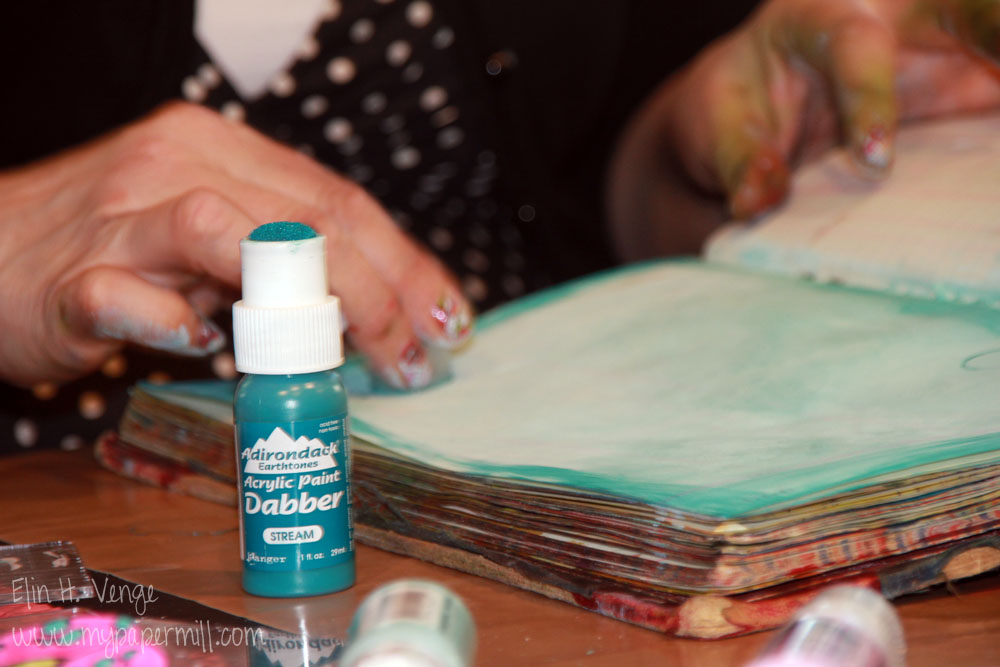 Dette er da starten på en AJ-side: noen dråper med dabber i fargen Aqua, hun var overlykkelig da hun fant noen helt hvite sider i boken sin. Ikke fullt så lykkelig en halvtime senere da hun ikke fant igjen siden hun holdt på med etter å ha bladd litt frem og tilbake for å vise oss enkelte ting.