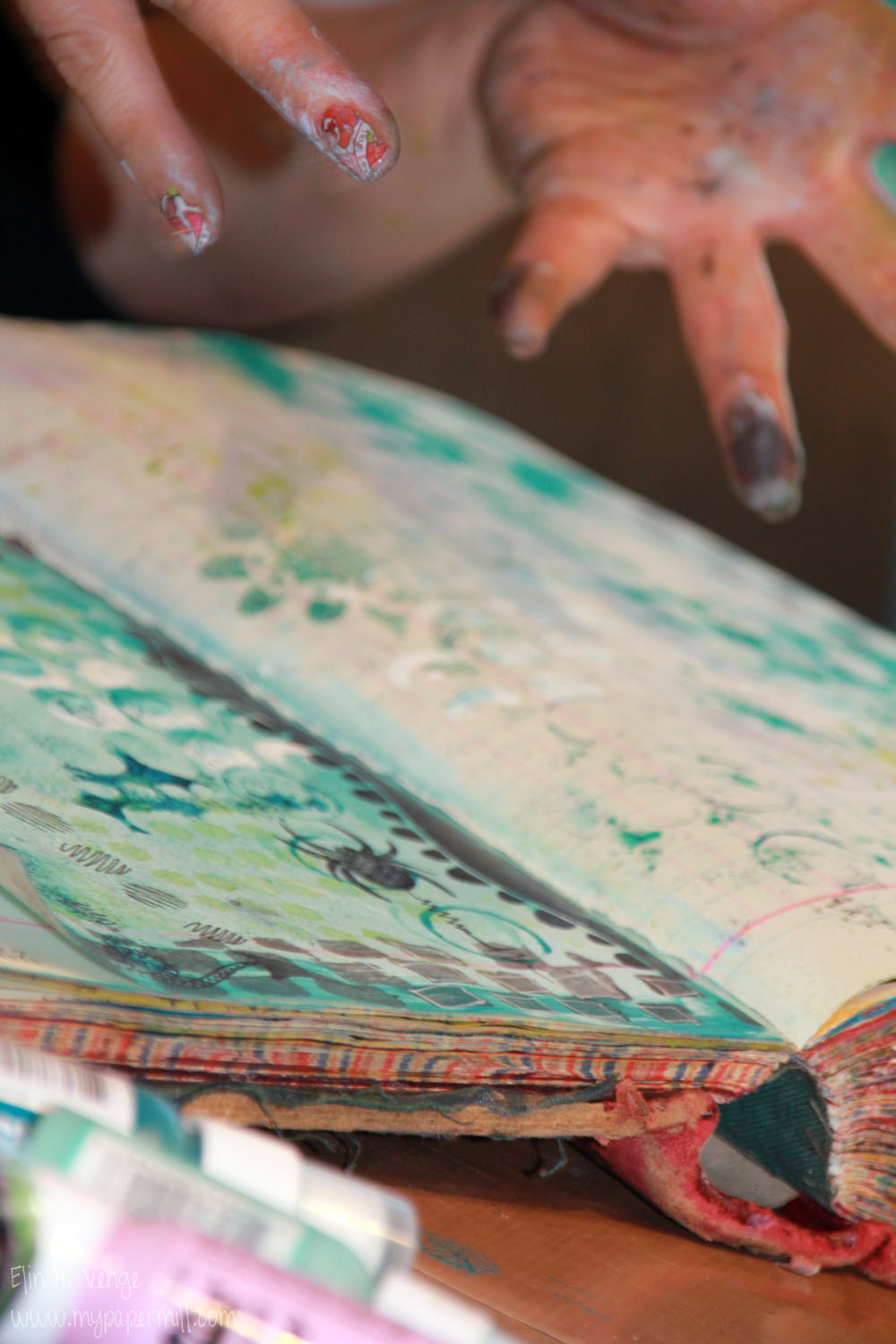 En ting som er litt kult er at hun baserer stemplene sine på AJ-sider hun har laget, sånn som denne. Hun sier selv at hun har måttet lære seg å tegne (fordi hun egentlig ikke kan det) og at hun ikke kan tegne en rett strek om livet hennes avhenger av det, men likevel har hun brukt biter av ferdige sider og tegnet om til stempler. Hun kan bruke et tusenbein som hals eller som øyenbryn, eller en haug med sopper som hår, hun har brukt tegninger av hus som kropper, dama har ingen slutt på fantasien. Og det var vel omtrent da vi var her, midt inni boken et sted, at hun ikke fant tilbake til den herlige turkise siden med de limegrønne detaljene hun holdt på med. Etter litt febrilsk blafring frem og tilbake i boken og hjelp fra oss som sa at det var lenger bak fant hun det til slutt, like før hysterien tok overhånd.